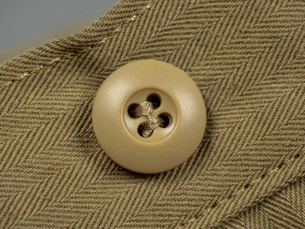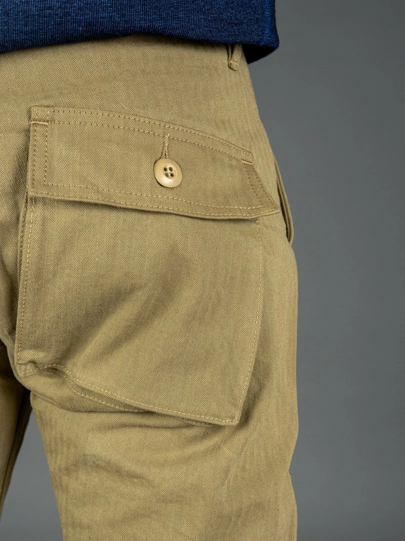 The fabric itself develops a lot of character with wear as well: it slightly fades, wrinkles, and the herringbone pattern becomes more pronounced. We see this fabric as the ideal HBT, even better than what you would find on vintage pieces.