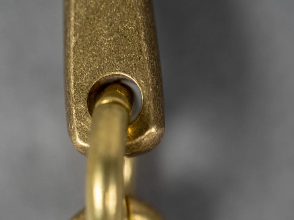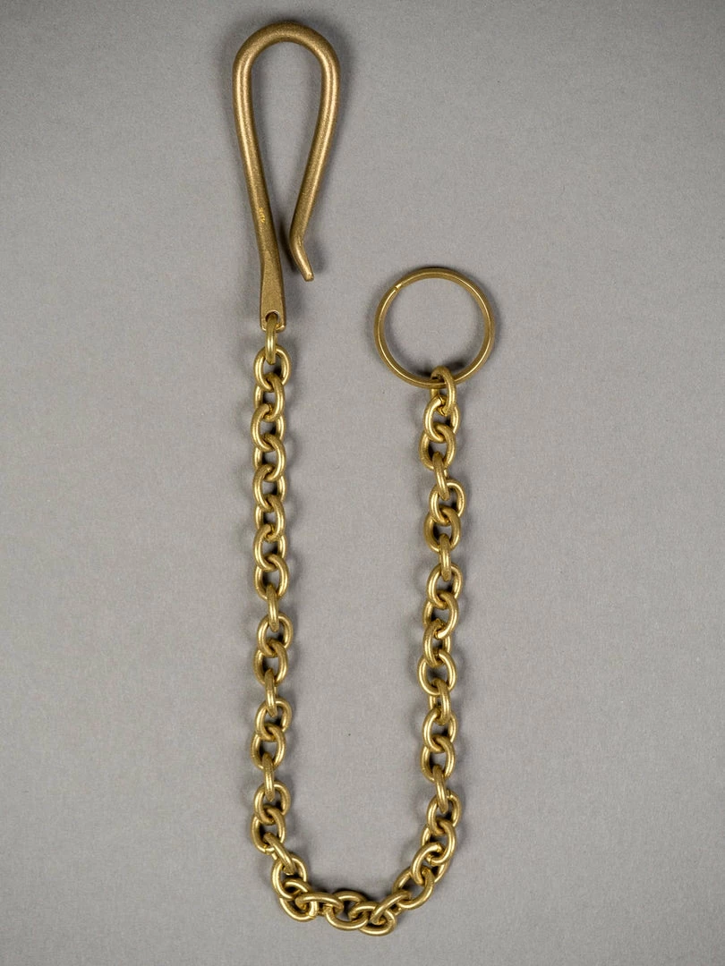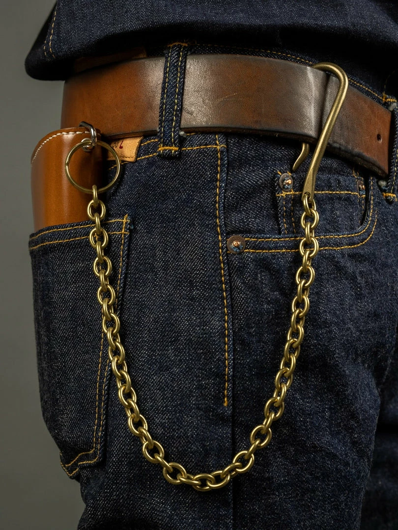 The original solid brass key hook made from the straight brass rod is handmade by a second-generation metal craftsman family. The curved shape fits the body; it is perfect for belt loops, coin pocket or belt. A master machine operator weaves the vintage-feel solid brass using a +100 years old a chain-making machine. The wire rolled rings selected are made by a speciality wire rolled ring company founded in 1972 in Tokyo. The solid brass double ring is produced by a small metal hardware supplier based over 80 years ago in Tokyo.