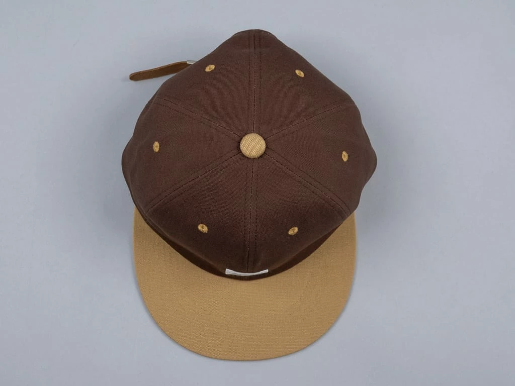 You can cap off your look with this robust brown and beige cotton twill combination in the classic six-panel style. This cap is adjustable with a leather strap and decorated with a Might Shine label. Additionally, six ventilation holes add functionality.