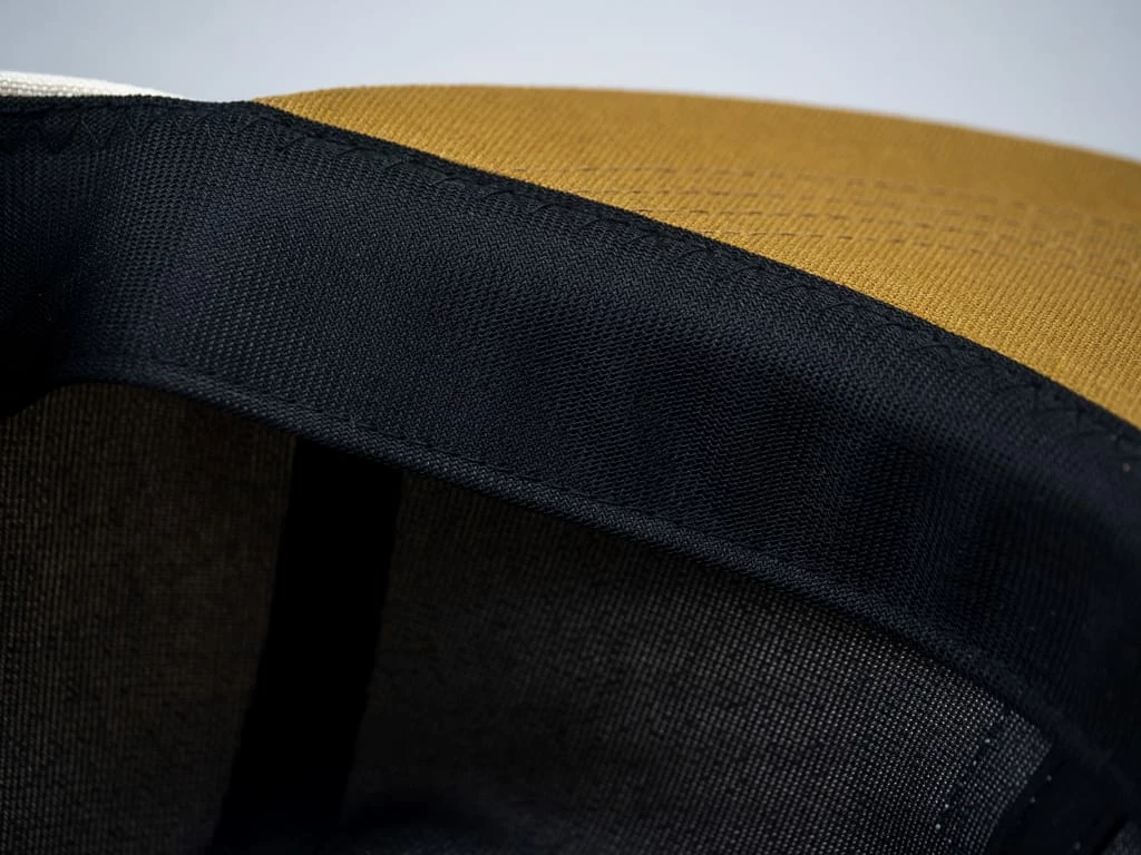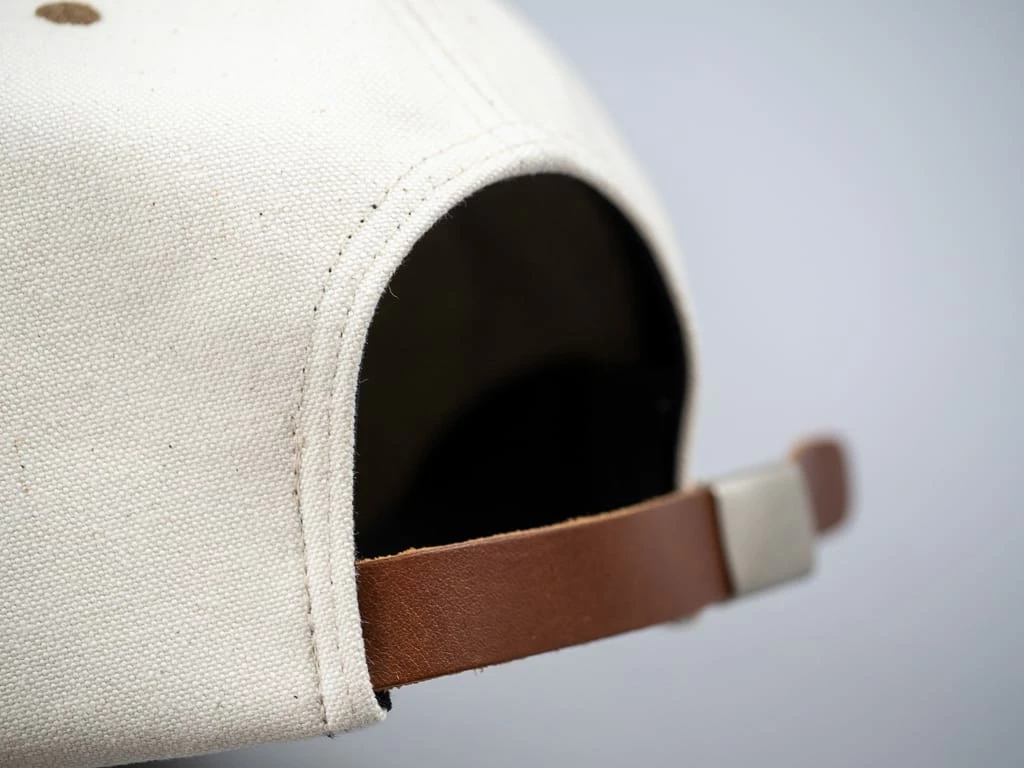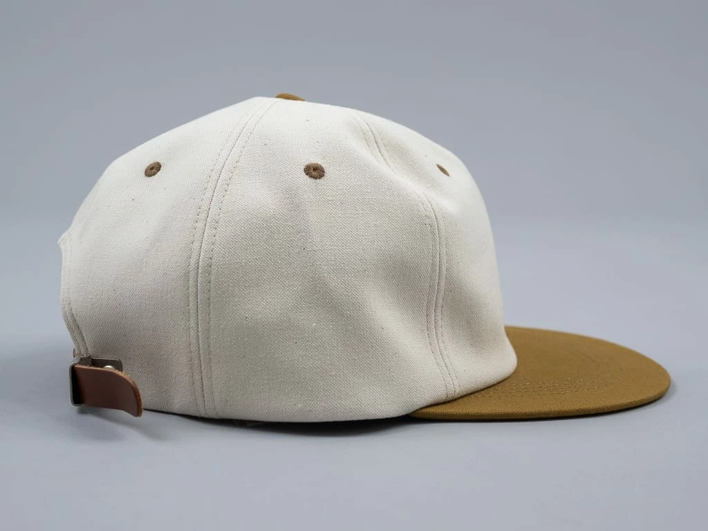You can cap off your look with this robust ivory and mustard cotton twill combination in the classic six-panel style. This cap is adjustable with a leather strap and decorated with a Might Shine label. Additionally, six ventilation holes add functionality.