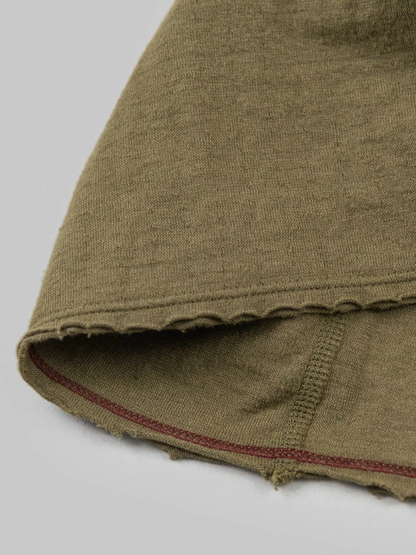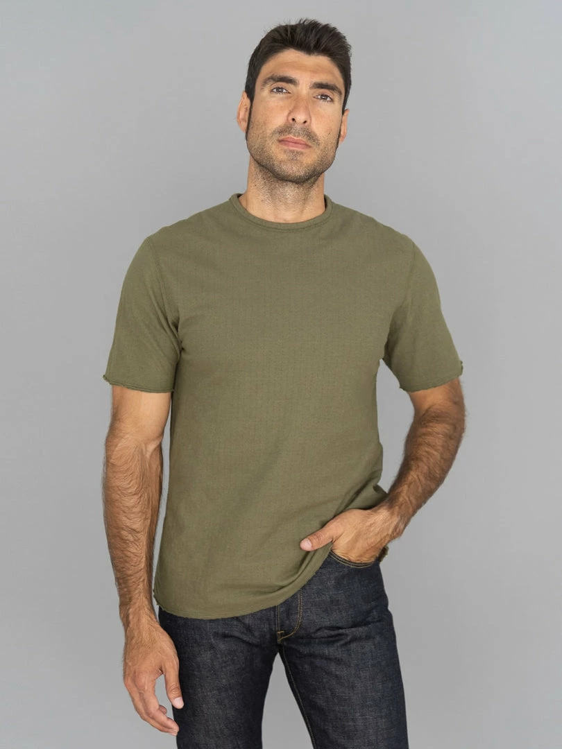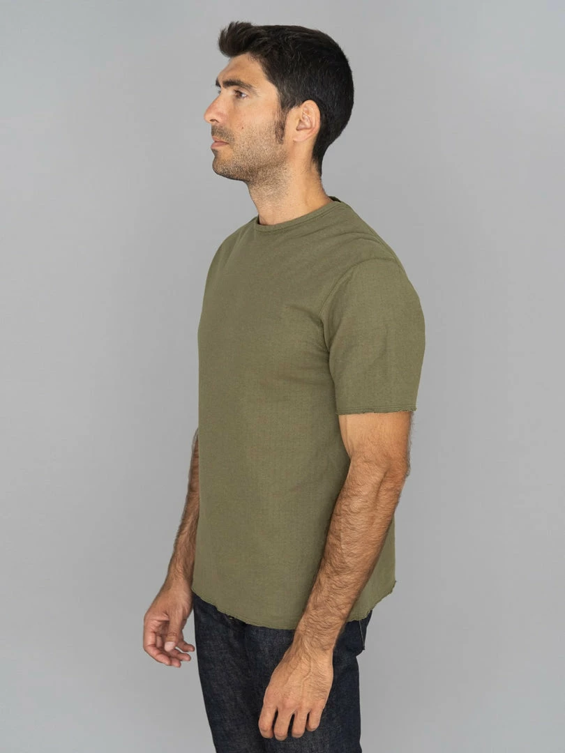 This low wedge crew neck tee features a special cut-off detail that gives it more of a worn-in vibe. The dual-layer fabric is made from a thicker-than-usual SZ (nº40) grafted yarn (yarn with a double twist in both directions to suppress skewing) and is knitted to a good thickness and fluffiness, resulting in a soft and silky knit.