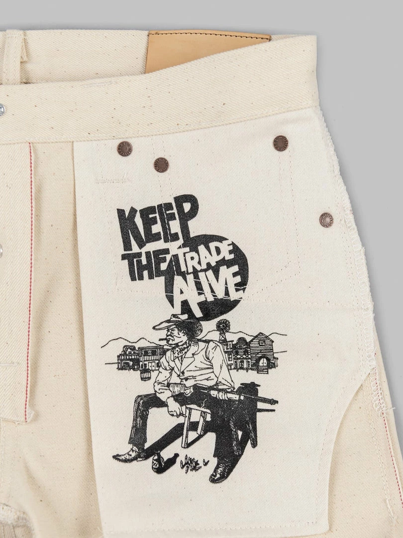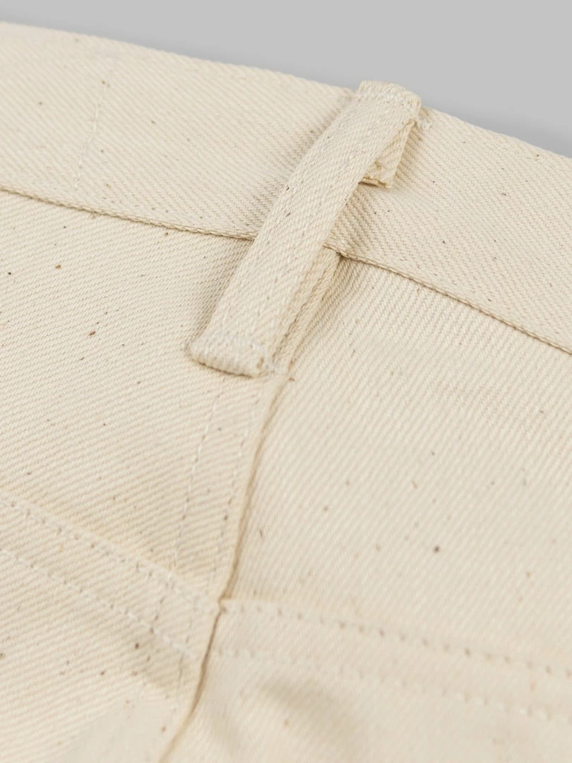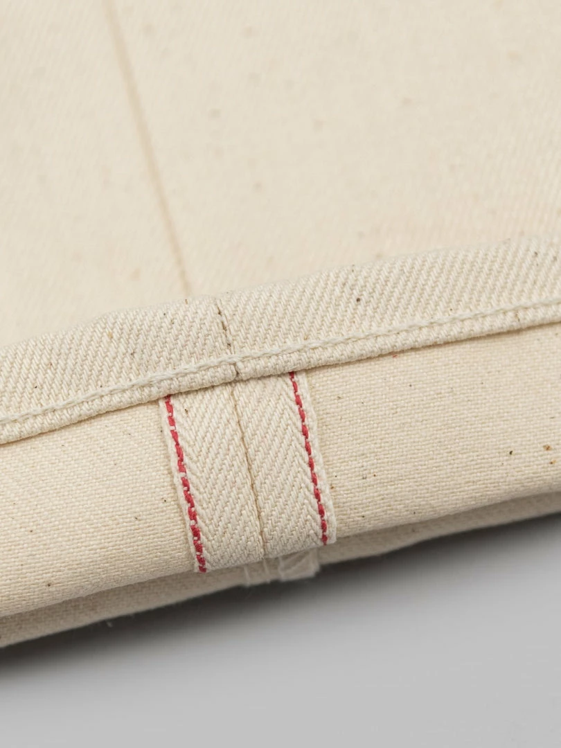 - 14oz sanforized Ecru Japanese selvedge denim from Nihon Menpu. It is sanforized, so expect no shrinkage