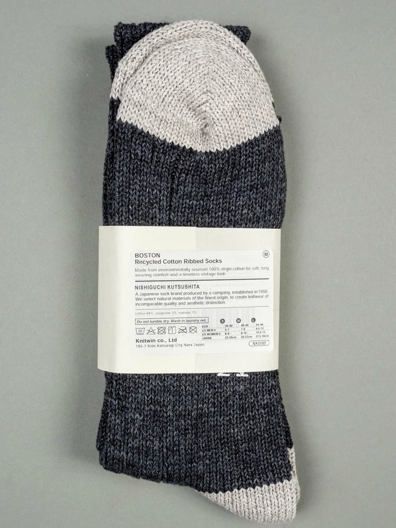 These socks are made from environmentally sourced 100% virgin cotton for soft, long-wearing comfort and a timeless vintage look. A cosy, comfy ribbed sock made with recycled cotton, features colour contrast at the toe and heel.
