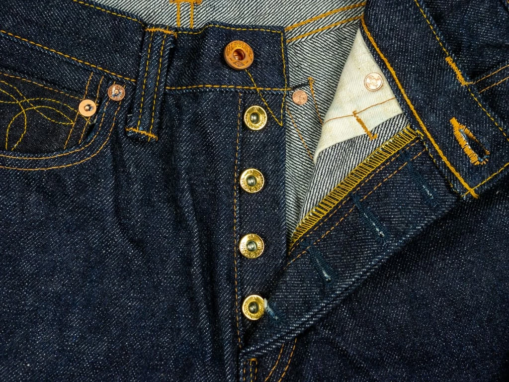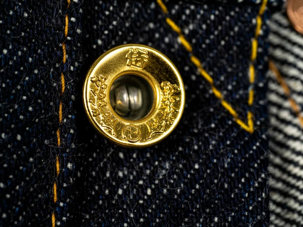- Fly buttons: Samurai’s gold pine open top buttons