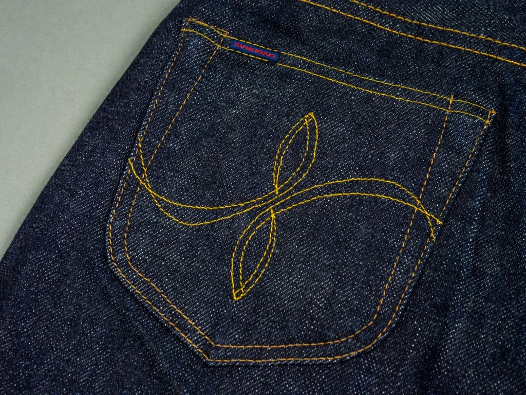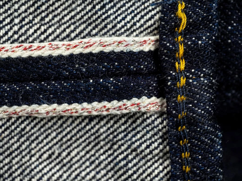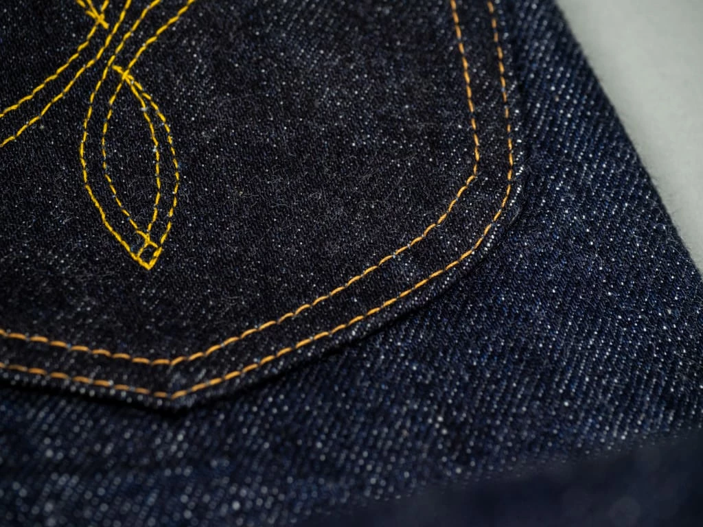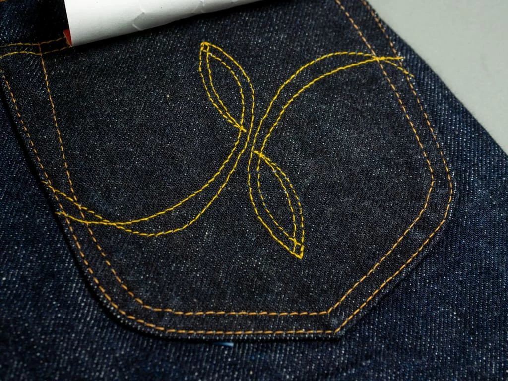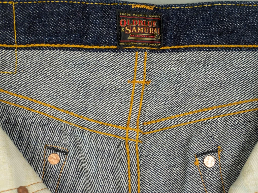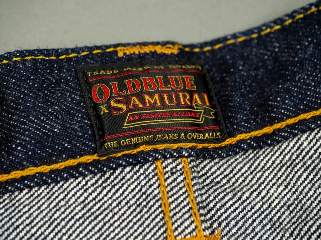 The most prominent detail on the denim is the back pocket, one of the key pieces in the collab denim. On one hand, the shape of the back pocket does not take the usual form of Samurai jean pockets, nor does the arc. For the arc they took inspiration in Samurai’s Yamato arc and incorporated it into Old Blue’s own arc: the “Double Looped” arc with the double-row stitching type. The result is simply wonderful, with both brands featured in the back pocket.