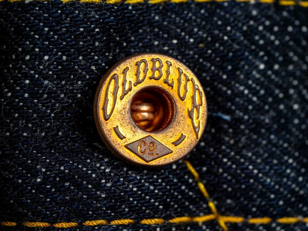 - Top button: Oldblue’s signature copper plated open top Scovill button