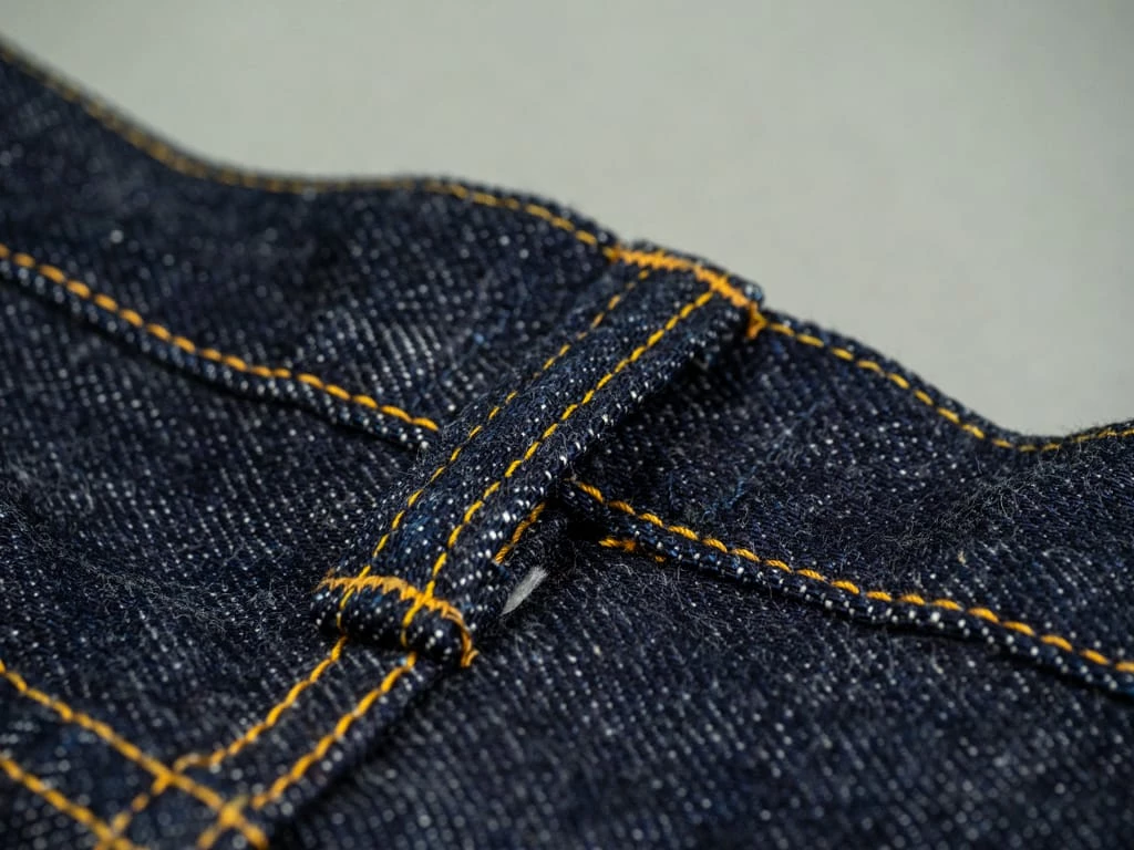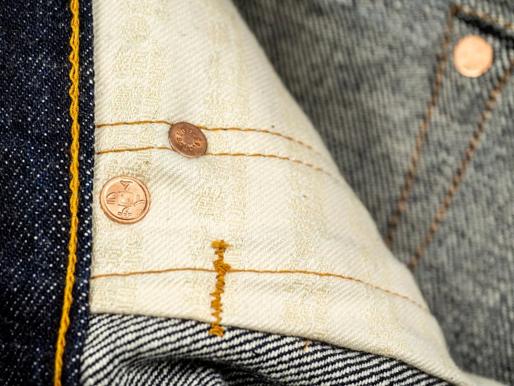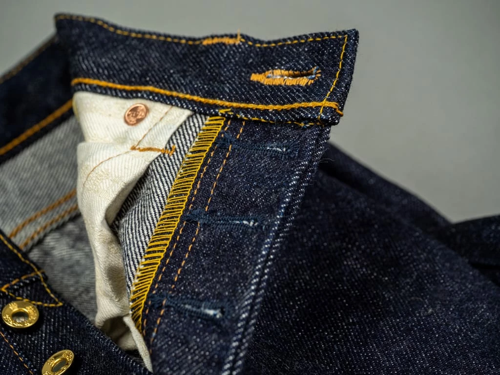 Lastly we should emphasize that these jeans are made not only from Samurai 21oz denim but also from Old Blue’s most representative denim: 21/23oz “Beast” denim. You must be wondering: where? Well, this fantastic combination of denims is to be found in the coin pocket. While at first glance it is very similar to the Samurai denim, you will notice a difference in the indigo hues of the coin pocket and the rest of the denim fabric. Plus Old Blue has put its characteristic “Looped Stitch” on the coin pocket.