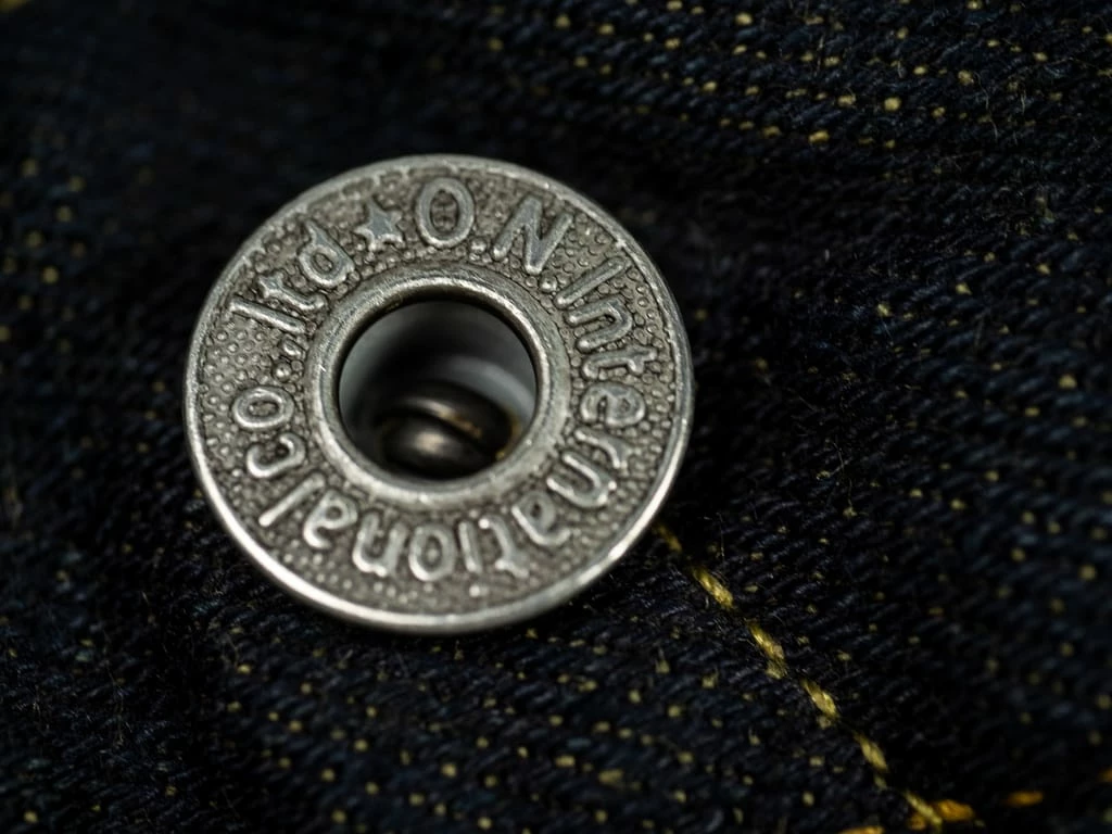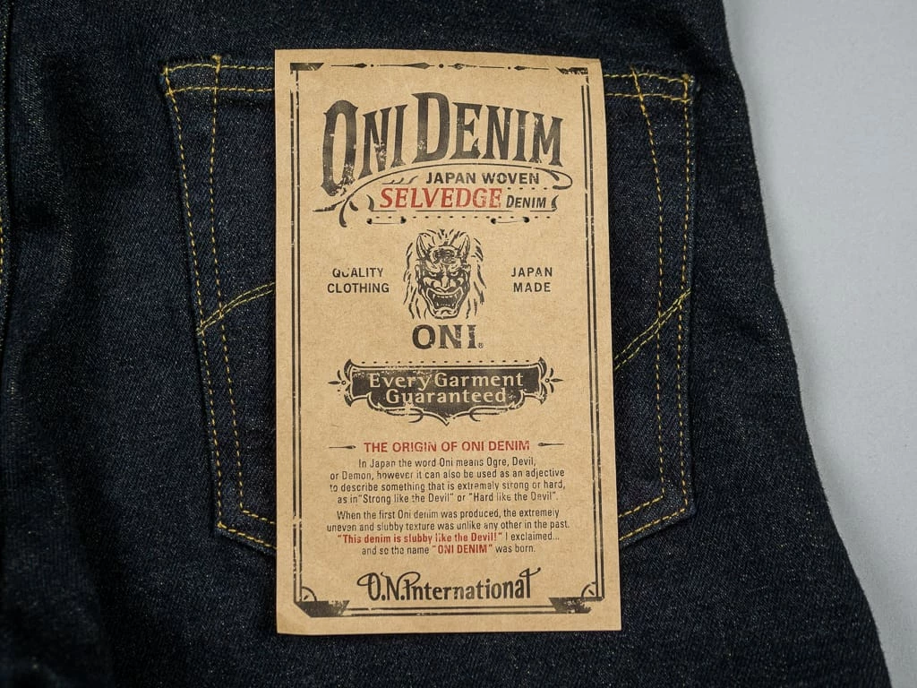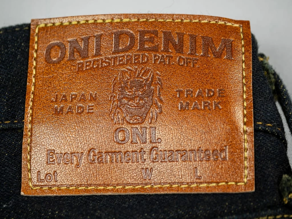 The jeans are made with all the superior-quality ONI details such as copper buttons and high-quality pocket bags. The patch is cut from premium deer leather. ONI opted to stitch the leather patch after the stone wash to get the best look. This process has been costly because the jeans needed to return to the sewing workshop after the washing process.