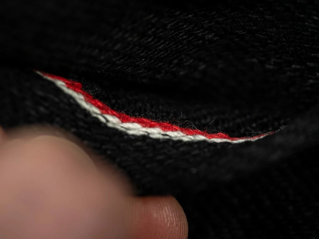 This time, Mr Oishi used dark indigo for the warp yarn and black for the weft yarn. So at first glance, you will feel it is black denim. But if you wear and wash it more and more, gradually the weft yarn comes out, and the denim’s colour will change to dark blue indigo.