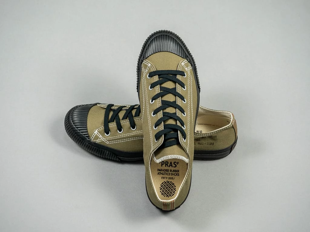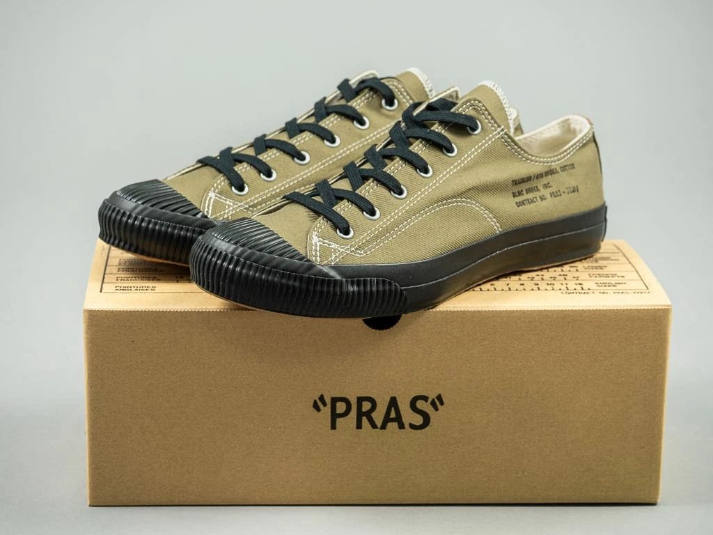 The Shellcap Low Sneakers from PRAS (Paradise Rubber Athletic Shoes) have everything you could want from a made-in-Japan low-top sneaker. This season, the brand has adopted a reproduction of the iconic French Army M47 fabric, a heavyweight olive serge manufactured in the late 1940s. The stamp on the left foot, inspired by military contract numbers, is all hand-stamped on each pair.