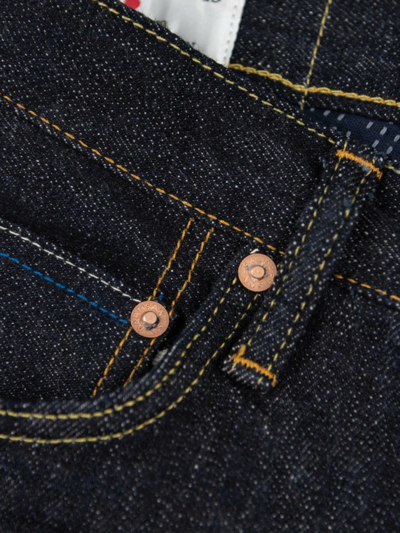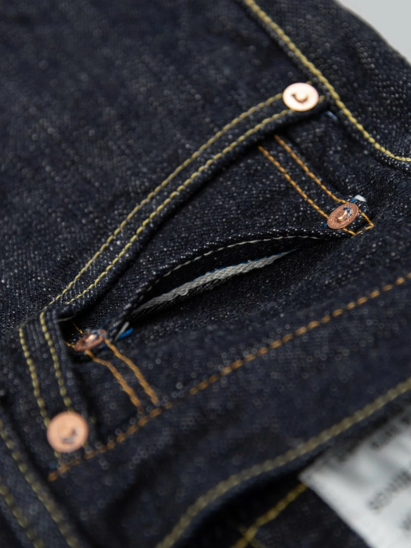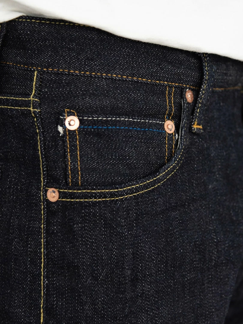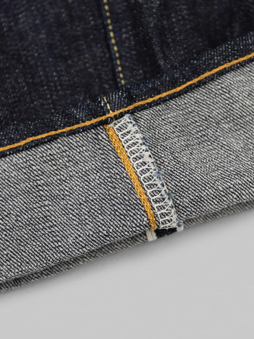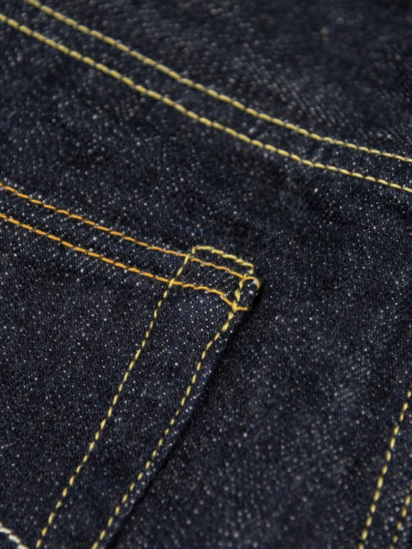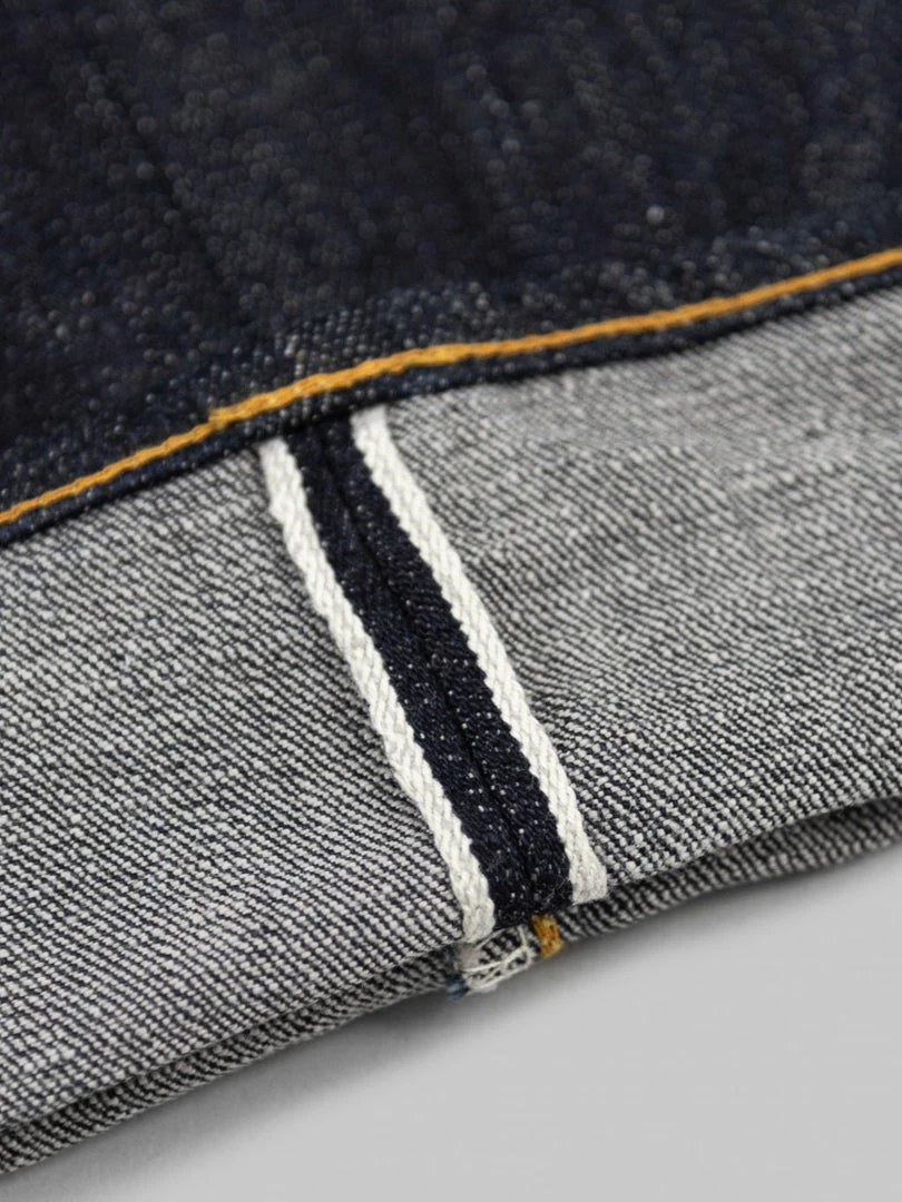 - 14oz unsanforized Japanese selvedge denim made of cotton and rayon kneaded with lava from Mt Fuji. It is a one-wash version so expect no shrinkage
