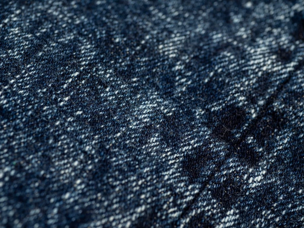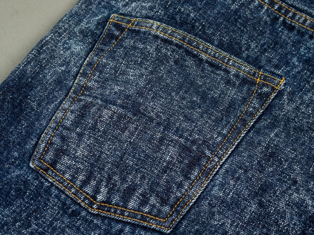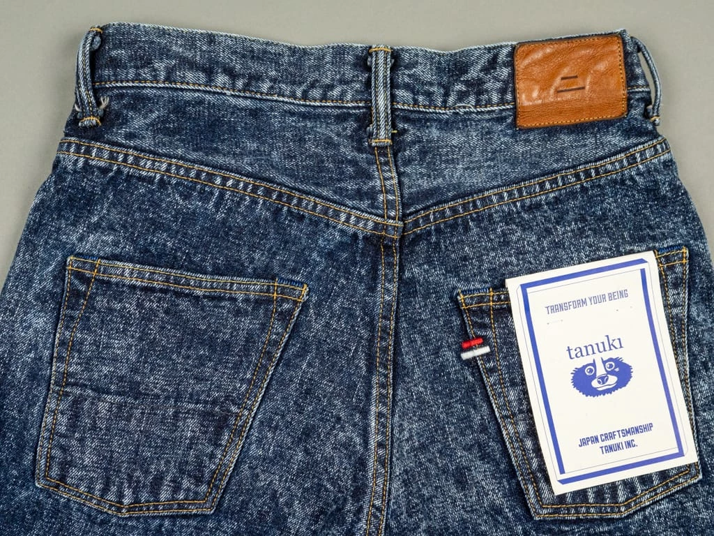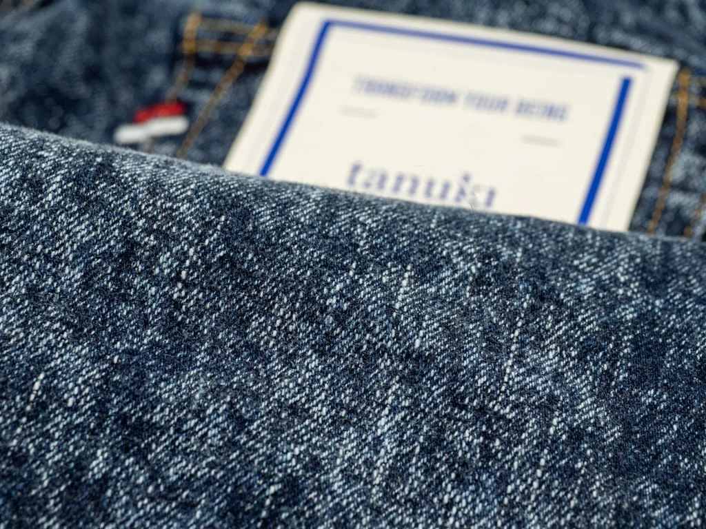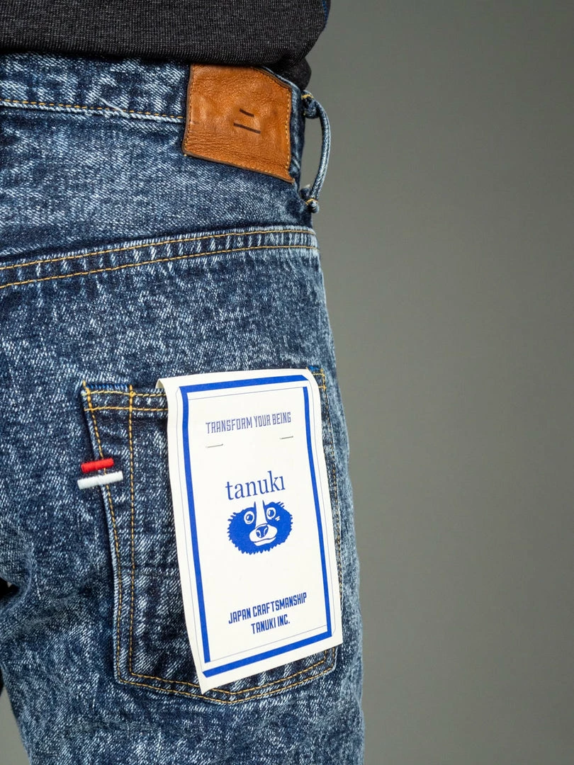 This is Acid Wash, a stunning treatment based on the brand’s popular Natural Indigo fabric. Tanuki opted for their Natural Indigo fabric for this treatment due to its rich and intense shades of blue. In addition, the natural indigo reacts better to the enzyme wash. This fabric allows for great fades and contrasts, making it unique. The fabric has been rope-dyed by the only mill in Japan able to do this type of natural indigo fabric and used special organic natural indigo from India that cannot be found anywhere else in the Japanese denim industry. This fabric is exclusive in many ways. Made with a low-tension weave, the denim is rich in slub and fuzziness on the surface to rival the beautiful blue of natural indigo.