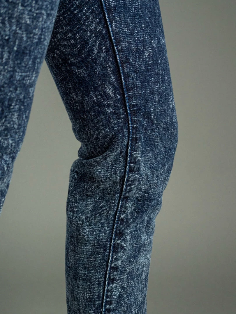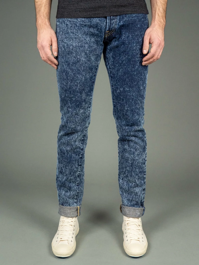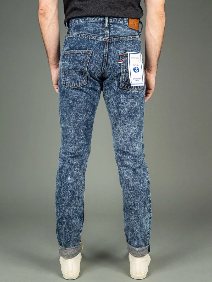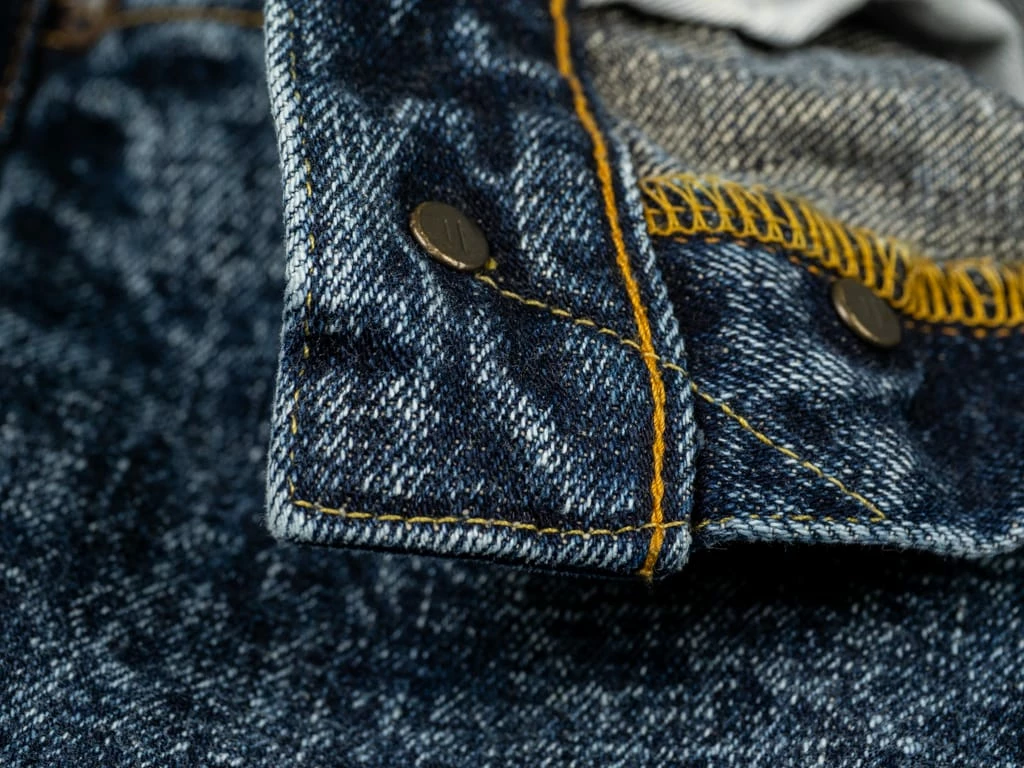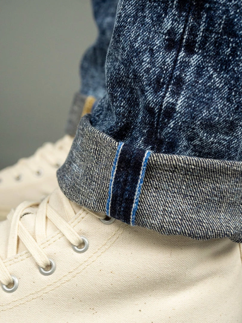 This is Acid Wash, a stunning treatment based on the brand’s popular Natural Indigo fabric. Tanuki opted for their Natural Indigo fabric for this treatment due to its rich and intense shades of blue. In addition, the natural indigo reacts better to the enzyme wash. This fabric allows for great fades and contrasts, making it unique. The fabric has been rope-dyed by the only mill in Japan able to do this type of natural indigo fabric and used special organic natural indigo from India that cannot be found anywhere else in the Japanese denim industry. This fabric is exclusive in many ways. Made with a low-tension weave, the denim is rich in slub and fuzziness on the surface to rival the beautiful blue of natural indigo.