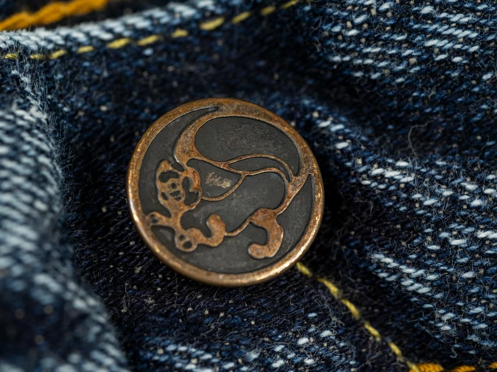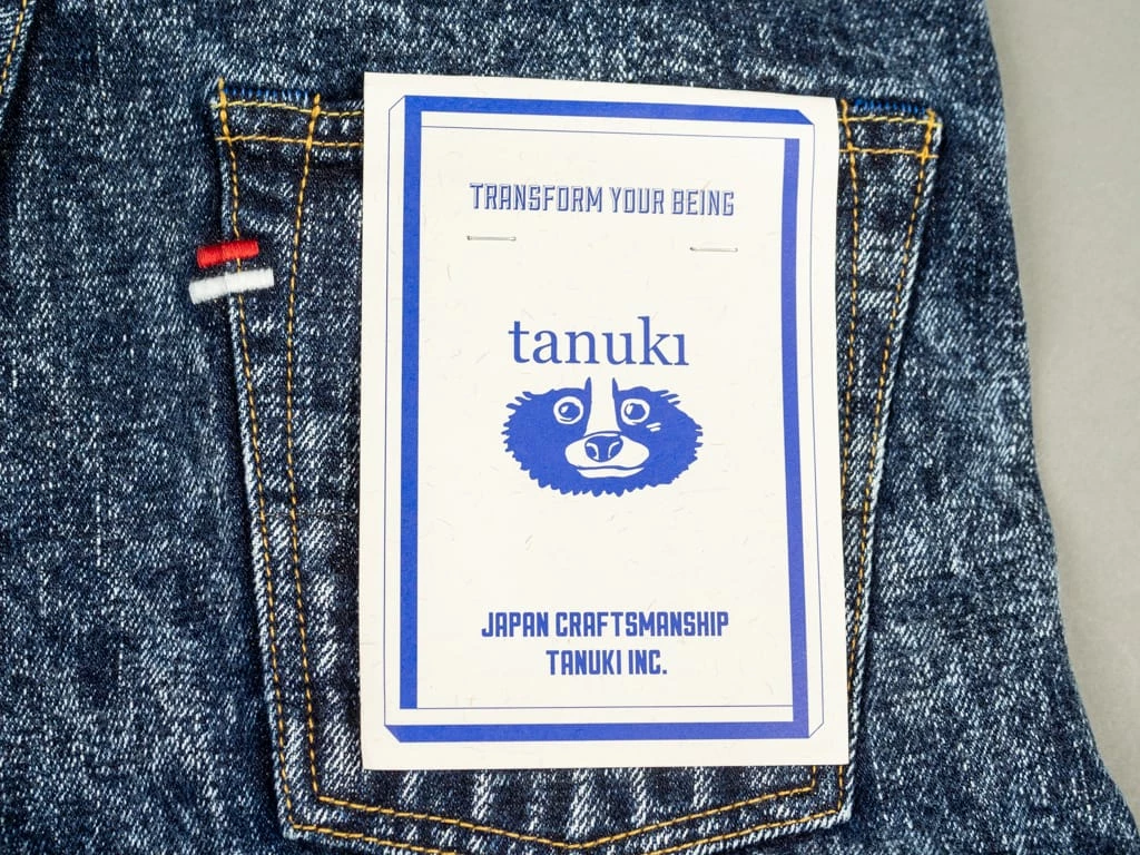 Near the back pocket, there is the embroidered Tanuki 二 (Ni) logo, two parallel lines in Japanese Kanji representing the number 2. The lower line represents the past, tradition, the standard, peace. The upper line represents the future, change, strength. The red and blue colours of their logo refer to Japan’s flag, honouring their roots as denim artisans.