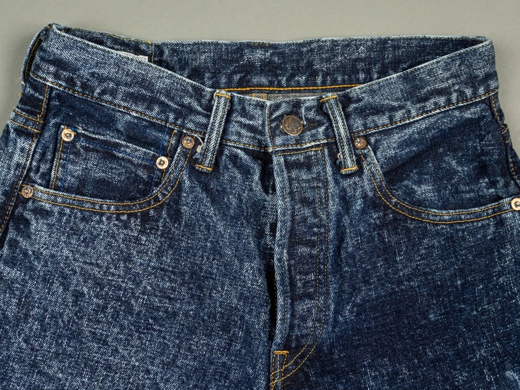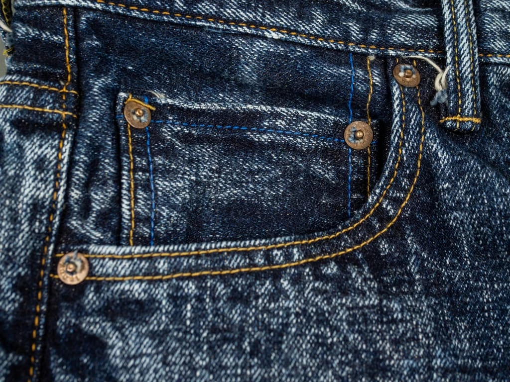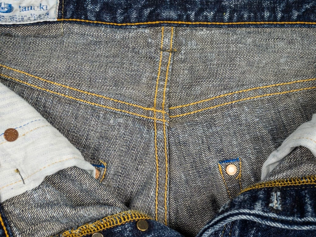 The jeans are made with all the superior-quality Tanuki details such as copper hardware, Tanuki logo embroidered back pocket detail, and the iconic Tanuki custom vegetable-tanned deerskin leather patch. The stitching for this one is quite remarkable: A variety of contrasting electric blue threads which really stand out.