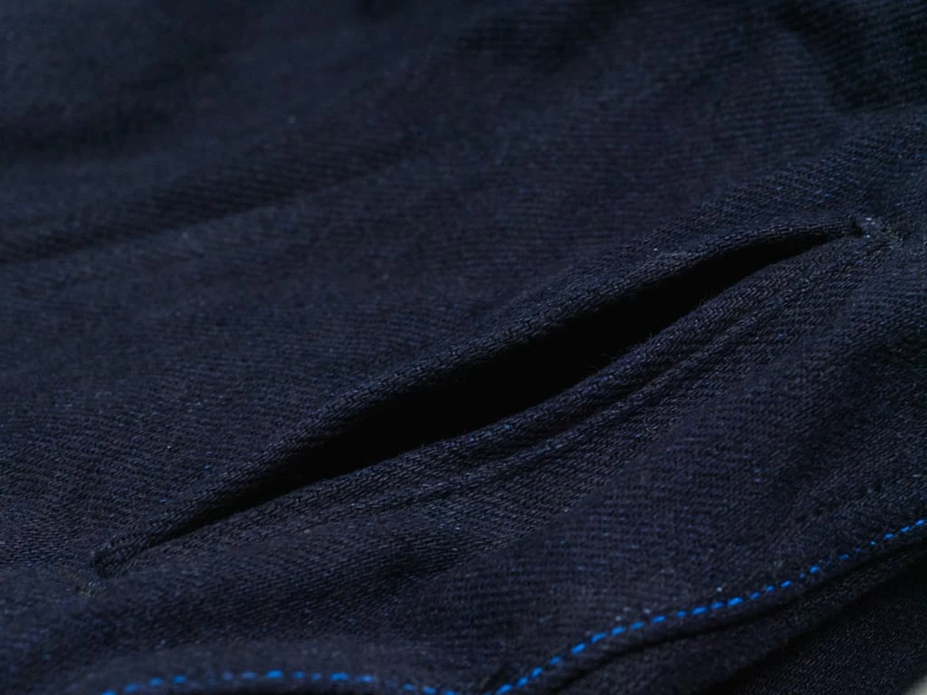 If you have been following the latest Tanuki launches, you have probably noticed that the brand has recently experimented extensively with Sumi (Japanese black ink), and for this fabric, they used it to dye the weft. It gives the indigo of the warp an incredible depth. We are very impressed with this fabric, and 静寂 translates into a deep silence. The outside is very rough, based solely on Texas cotton, giving these jeans a crisp texture. They used a combination of Supima and Californian cotton for the inside, which gives a nice textured yet very comfortable feel.