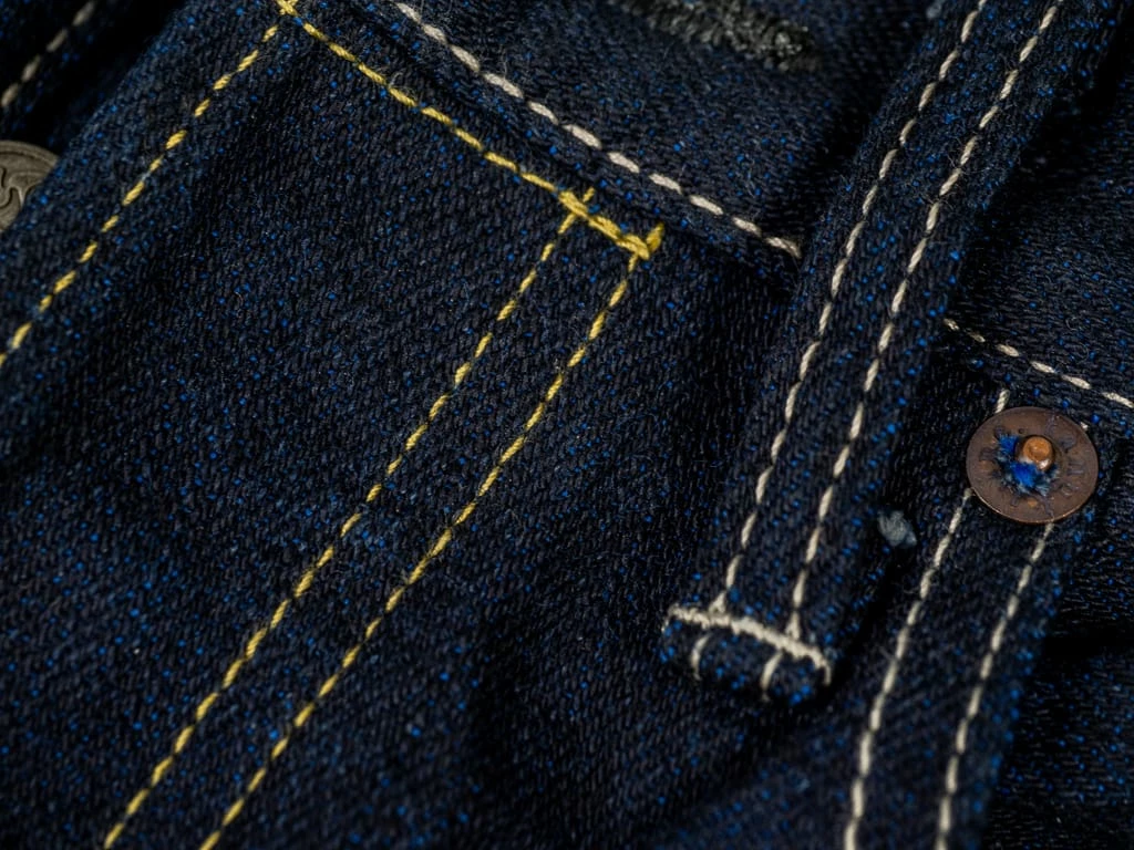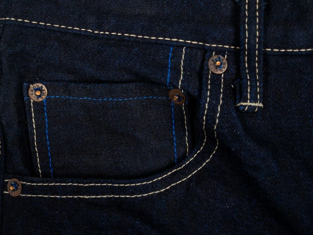 The colour reminds us of the Tanuki blue that runs through all their products: YURAI means source. The denim is rich in slub and fuzziness on the surface and thanks to the loose weave, the cobalt blue peaks through the surface, which adds depths to the denim. The electric blue fades will be very unique. The banana and light beige stitching adds just the right amount of contrast to this fabric.