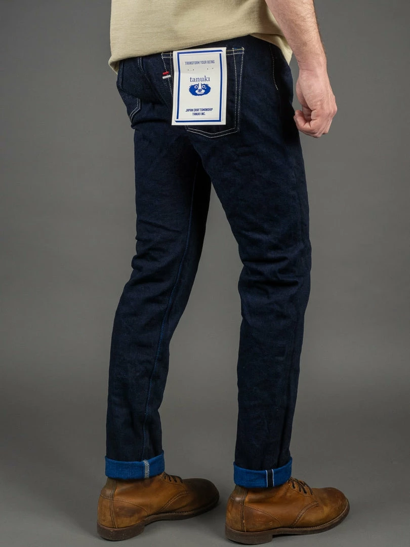 The jeans are made with all the superior-quality Tanuki details such as copper buttons, embroidered logo back pocket detail and the iconic Tanuki custom vegetable-tanned deerskin leather patch. Tanuki has included a Japanese extra-durable herringbone cotton-lined fabric in front pockets and an electric blue and white selvedge ID.