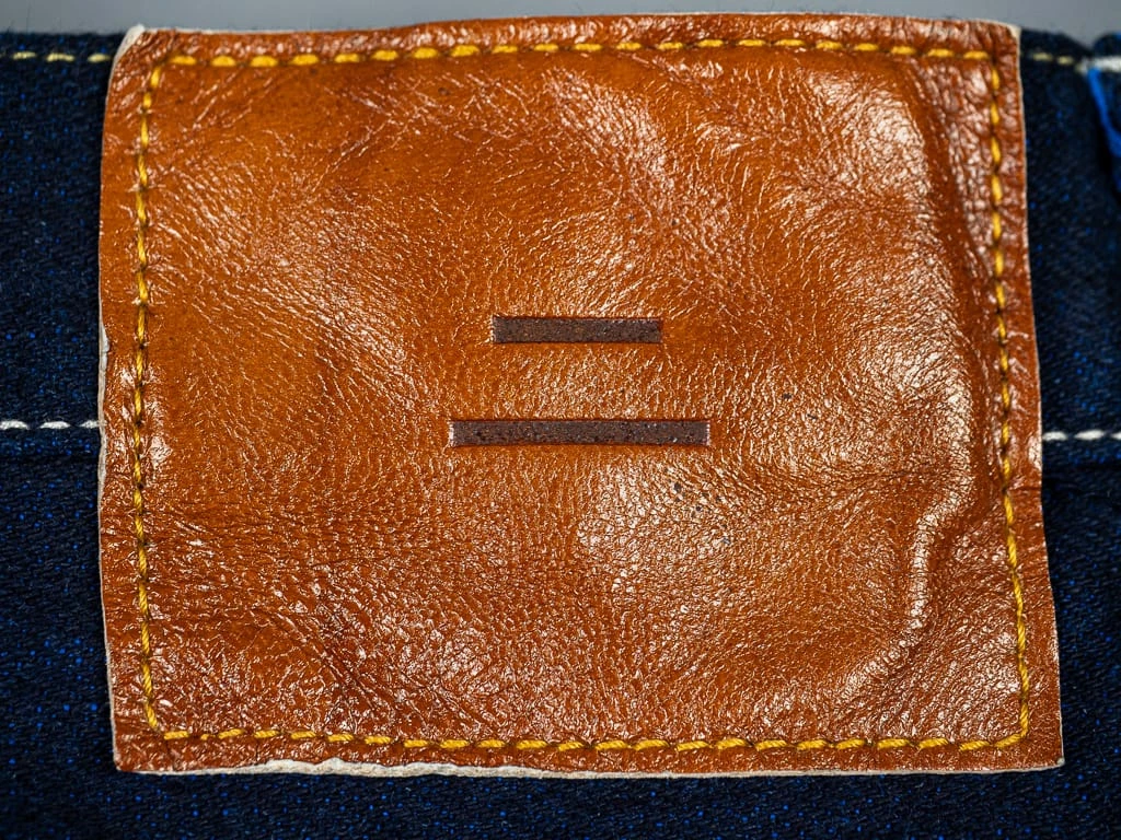 Near the back pocket, there is the embroidered Tanuki 二 (Ni) logo, two parallel lines in Japanese Kanji representing the number 2. The lower line represents the past, tradition, the standard, peace. The upper line represents the future, change, strength. The red and blue colours of their logo refer to Japan’s flag, honouring their roots as denim artisans.