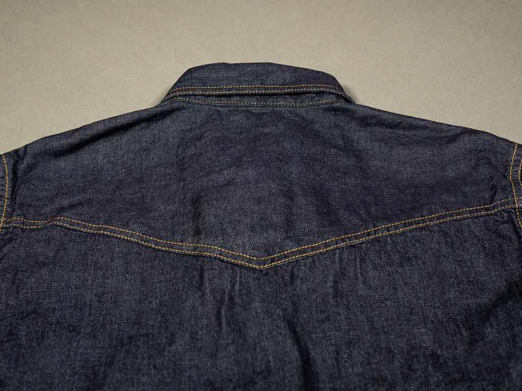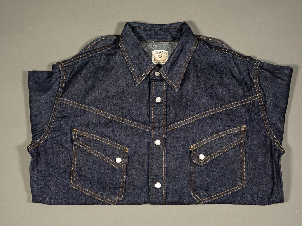 The TCB Ranchman shirt is a reproduction of the classic American western denim shirts of the 1940s. Carefully reproduced to be as close to the original as possible but with a slightly updated fit for a more contemporary look and comfortable wear. It is made with a raw 8.5oz sanforized natural Mura denim fabric. From the fabric to sewing to silhouette, it is made with care down to the last detail. It has two western pockets in the chest, both with snap buttons made of white shellfish.
