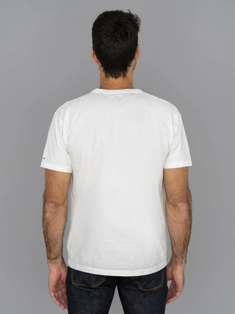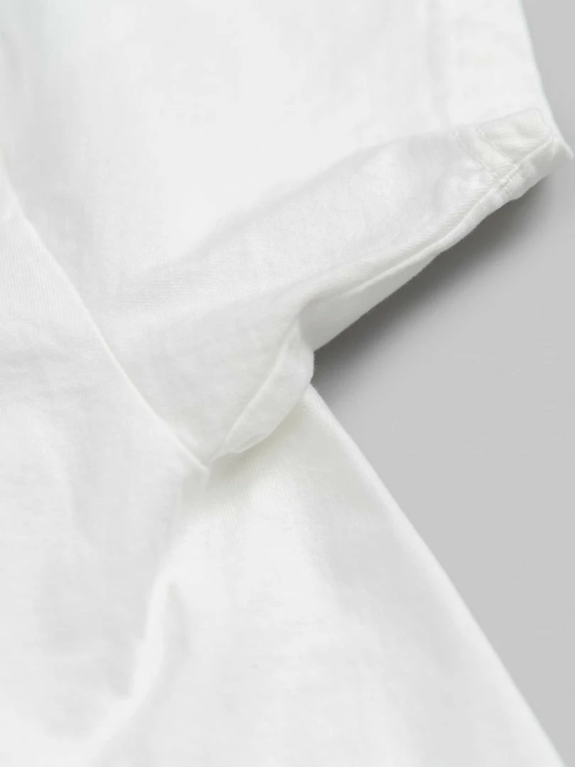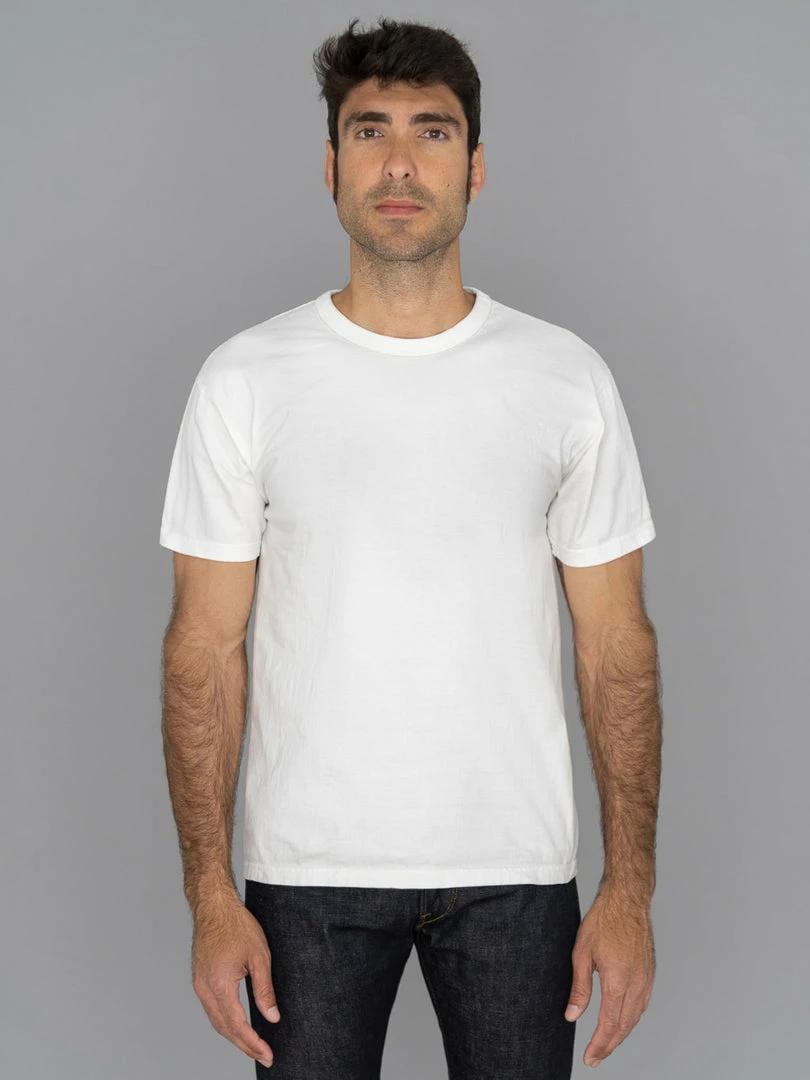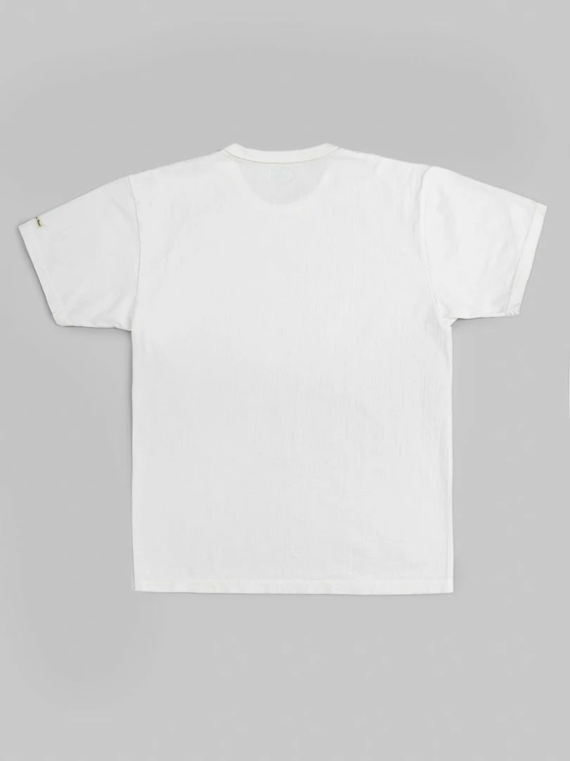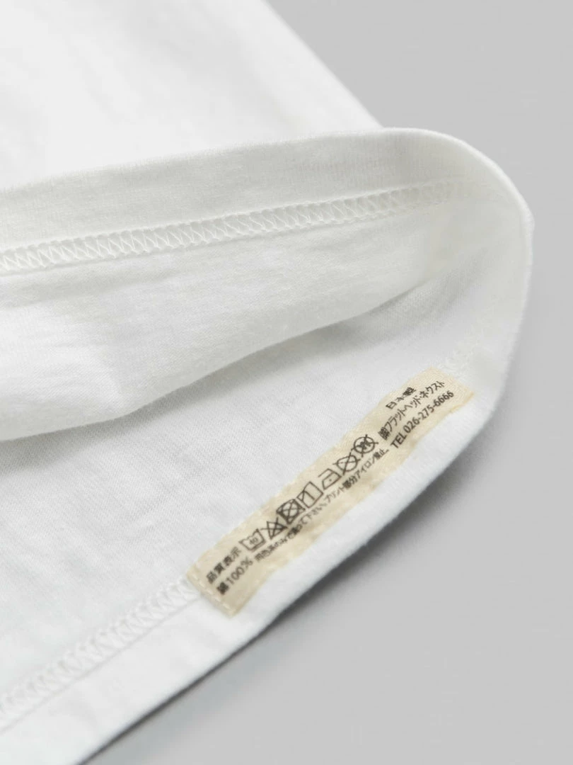 This Loopwheeled (“Turi-Ami”) t-shirt is woven using only premium long-staple cotton in the Japanese Kanekichi Wakayama workshop, one of only two workshops in the world still keeping in operation after more than 100 years the tubular textile production machines that allow seamless garments to be made. The only tension used in the knitting process is gravity, the end result being a knitted fabric with virtually no inbuilt stress or tension. A loopwheel machine rotates at just 24 revolutions per minute, a modern knitting machine in excess of 10 times that. The result is a very soft but strong fabric and the best tee material made today.