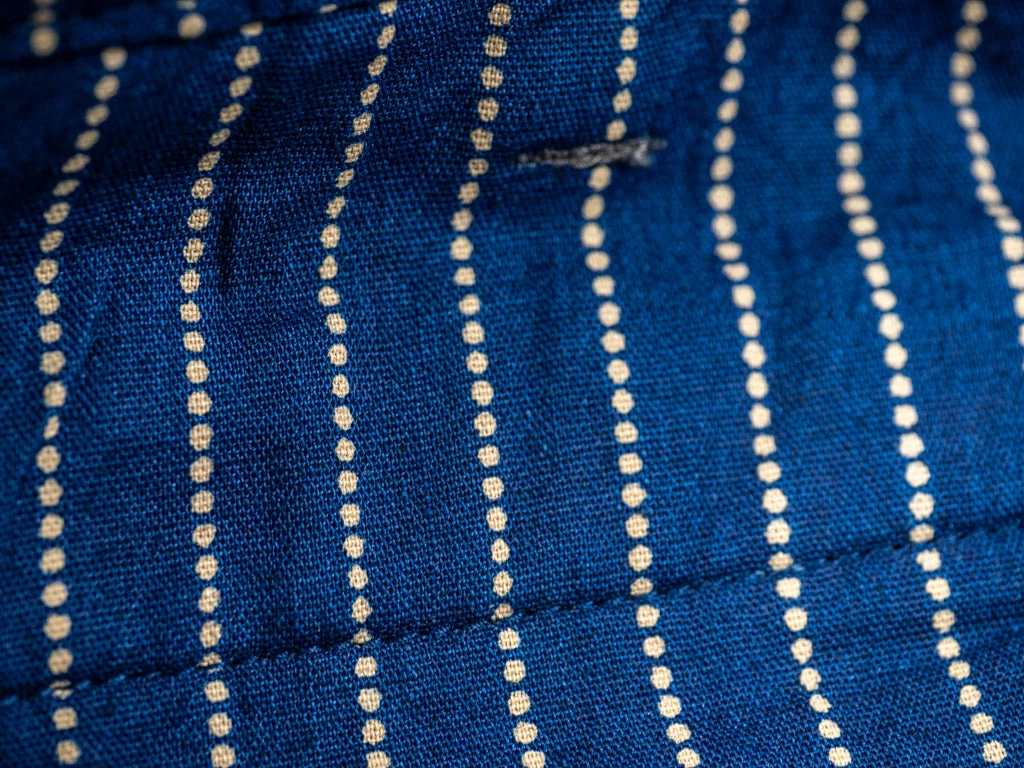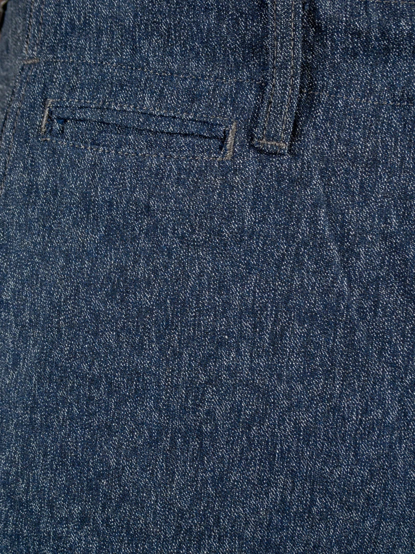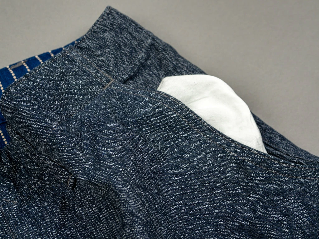 - Indigo discharge-dyed Japanese-milled 5 oz. chambray Wabash waistband, back pocket bags, and fly piping