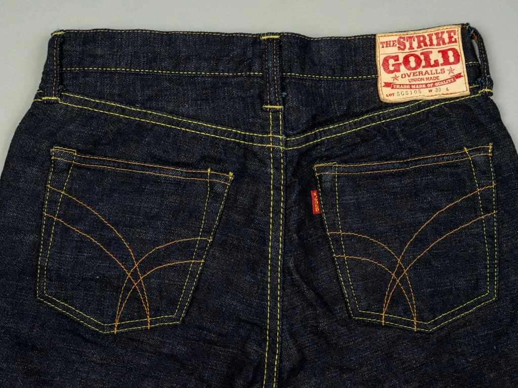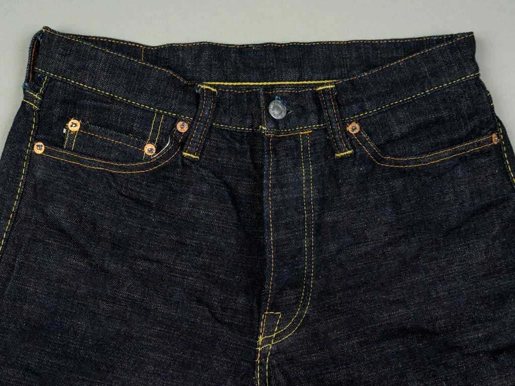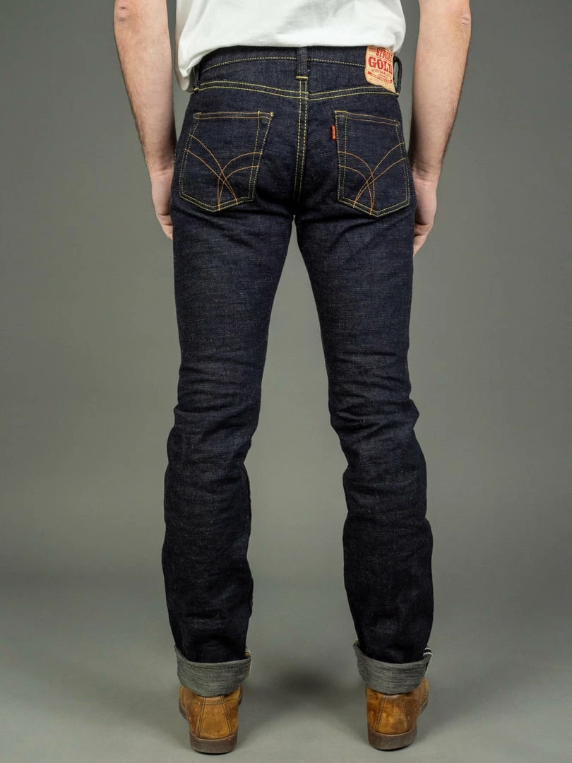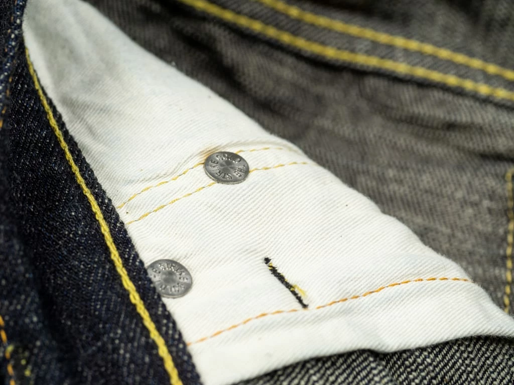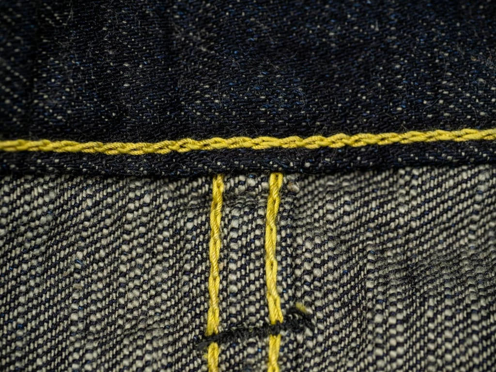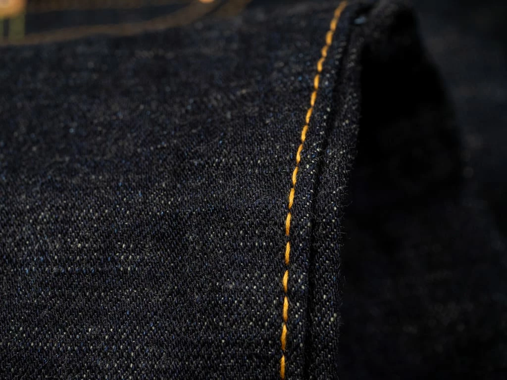 The “SG5105 slubby” jeans are the lightest option in the Strike Gold’s range. These are made of an unsanforized 15oz slubby pure indigo warp and grey weft denim. The fabric has been woven using a super short cotton staple for the weft. The staple length refers to the length of the fibres of any given material. In terms of cotton, this is the average length within a sample of a species. Cotton with longer staple lengths tends to produce softer and hairier fabrics than those with shorter ones, but short-staple fabrics tend to have a fantastic rugged and extremely uneven touch.