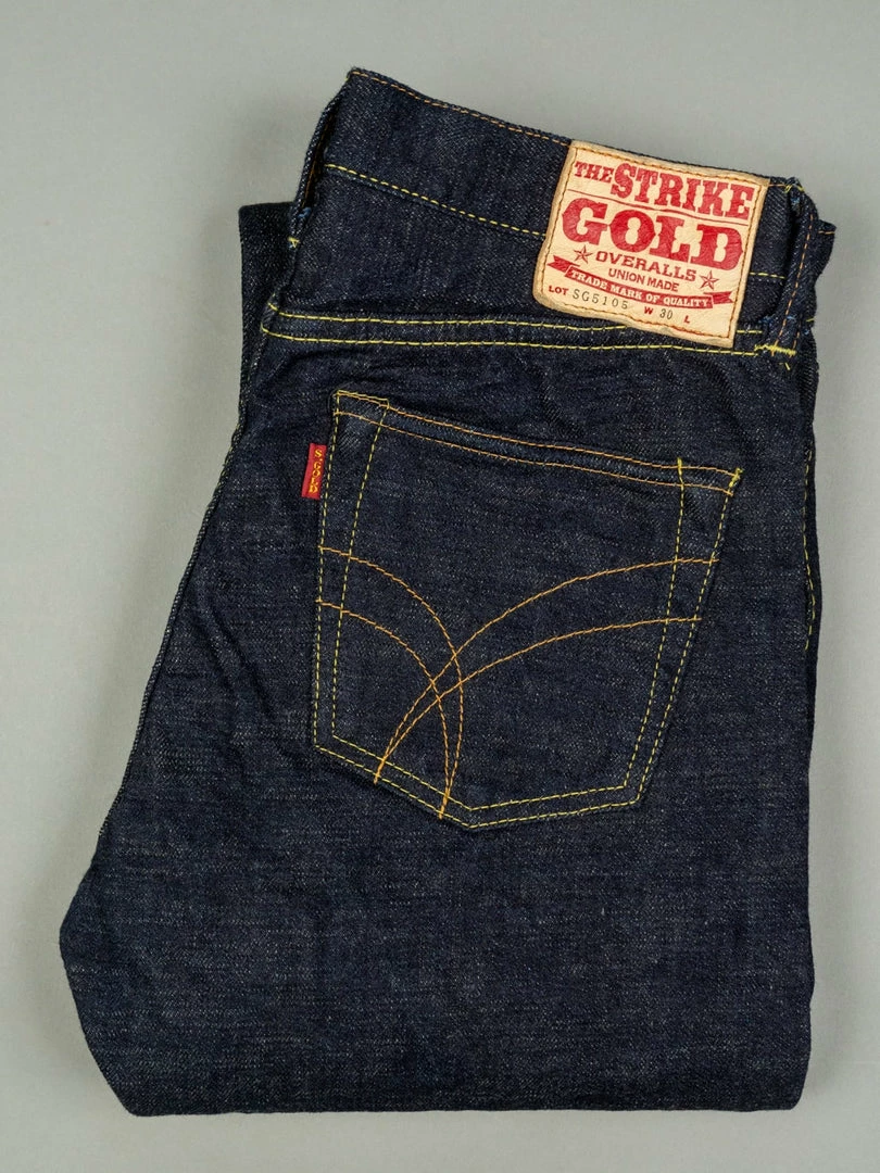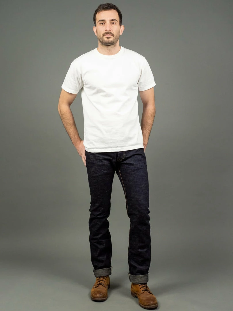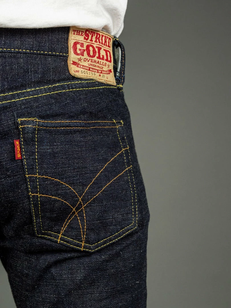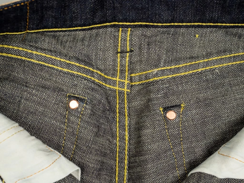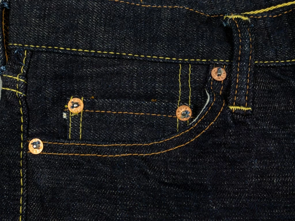 The “SG5105 slubby” jeans are the lightest option in the Strike Gold’s range. These are made of an unsanforized 15oz slubby pure indigo warp and grey weft denim. The fabric has been woven using a super short cotton staple for the weft. The staple length refers to the length of the fibres of any given material. In terms of cotton, this is the average length within a sample of a species. Cotton with longer staple lengths tends to produce softer and hairier fabrics than those with shorter ones, but short-staple fabrics tend to have a fantastic rugged and extremely uneven touch.