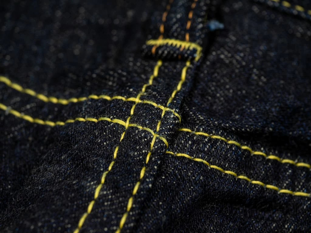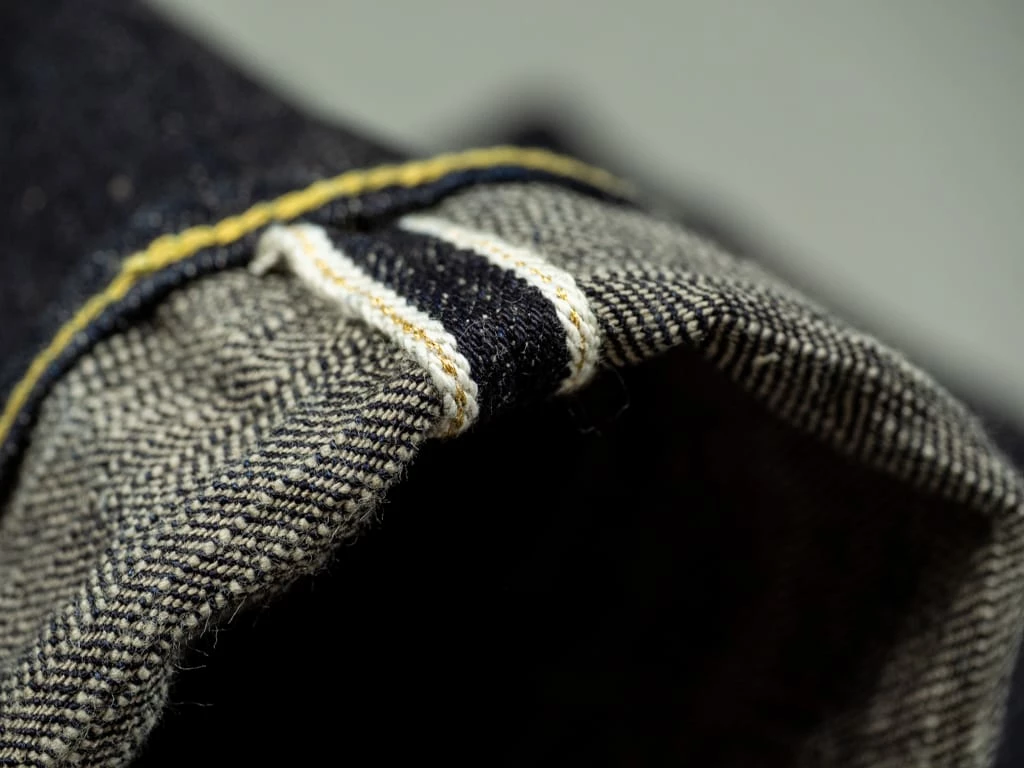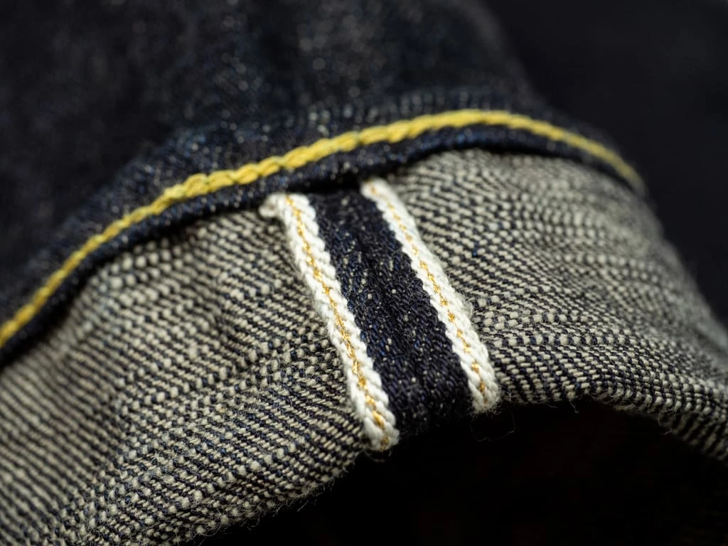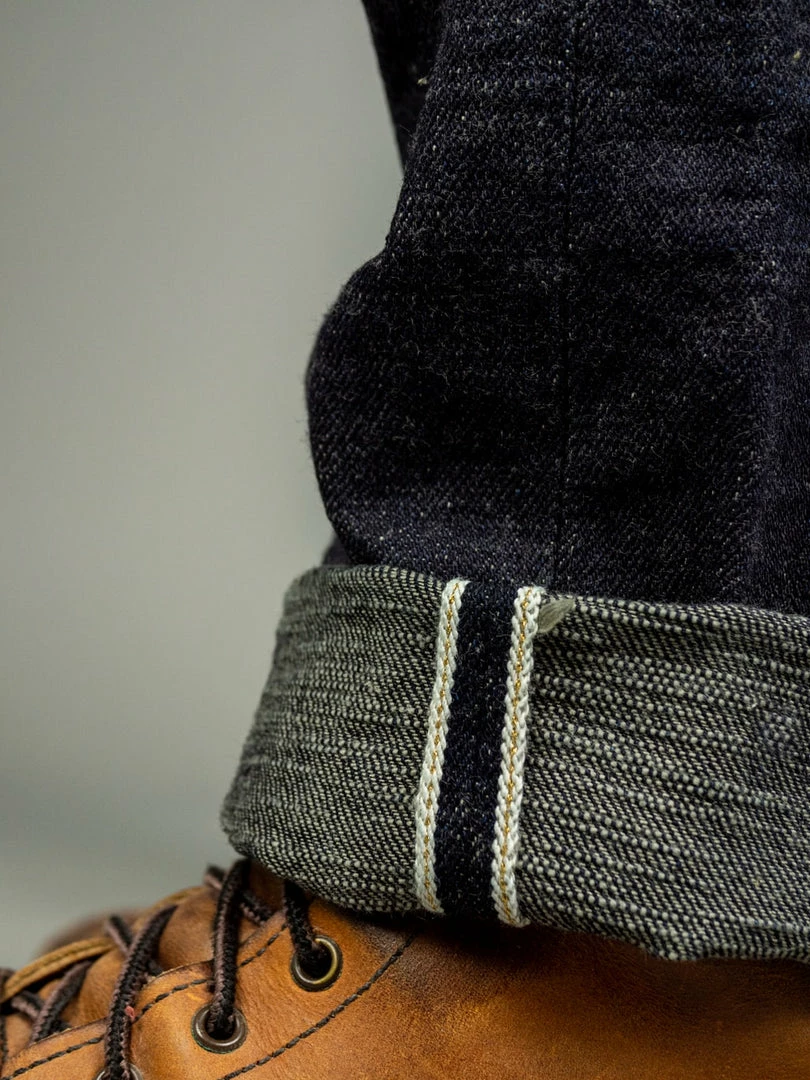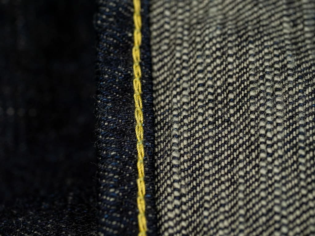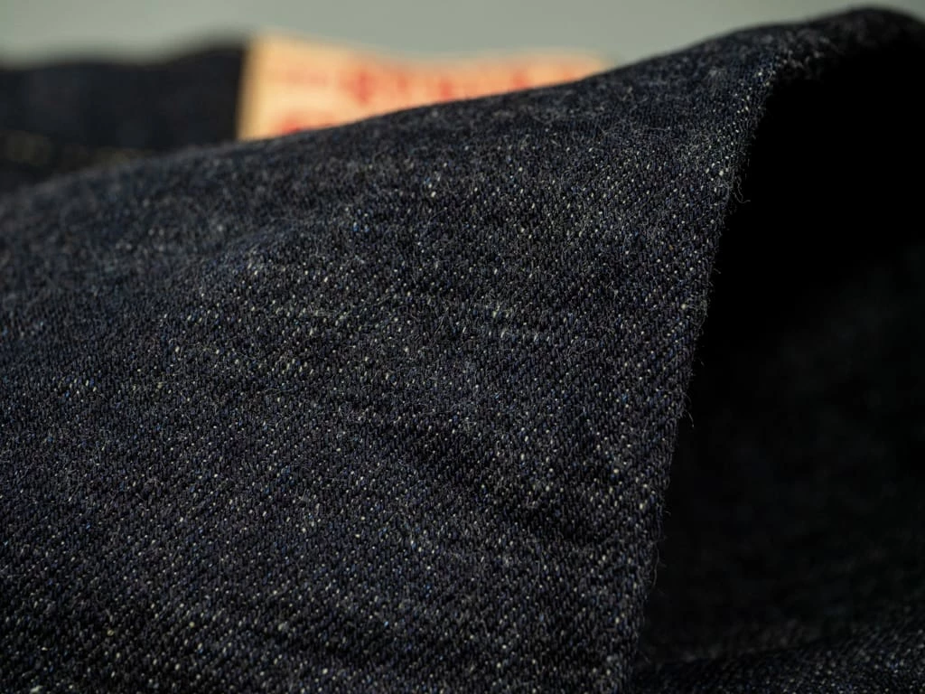 - Unsanforized one-wash selvedge 15oz slubby indigo-grey fabric, woven with super short staple cotton weft threads