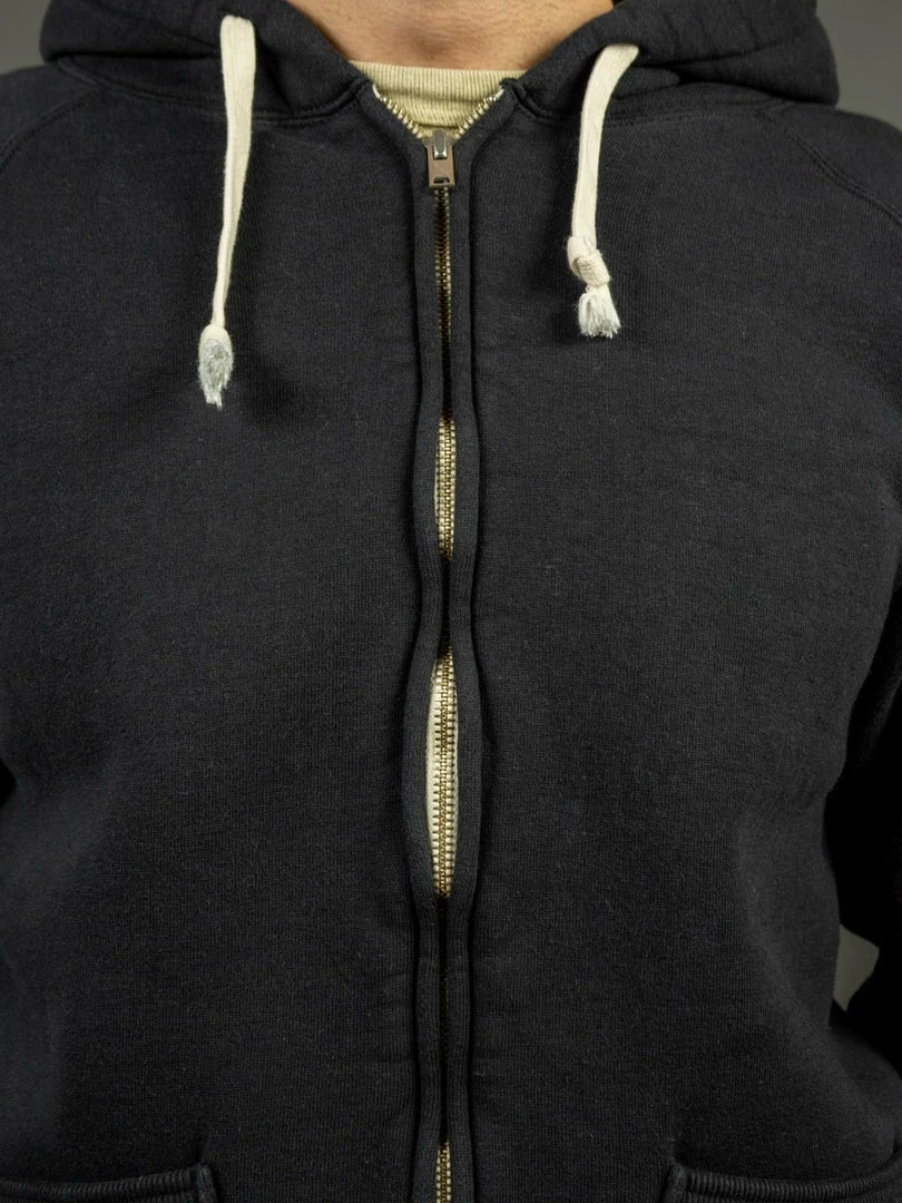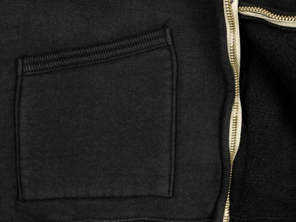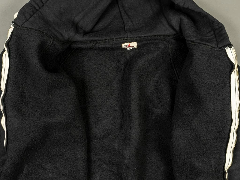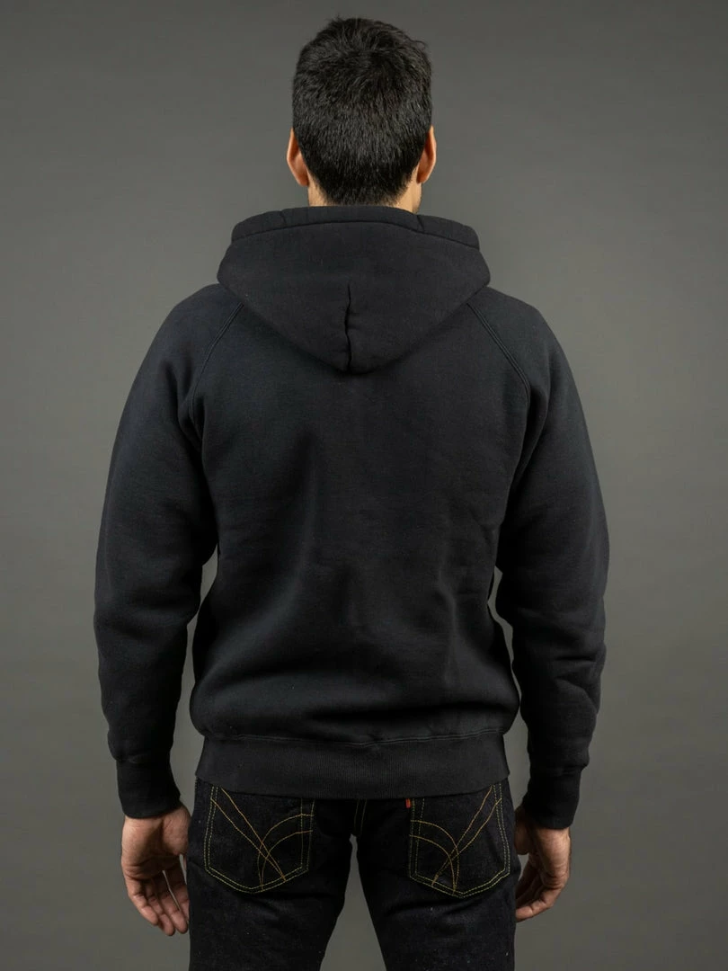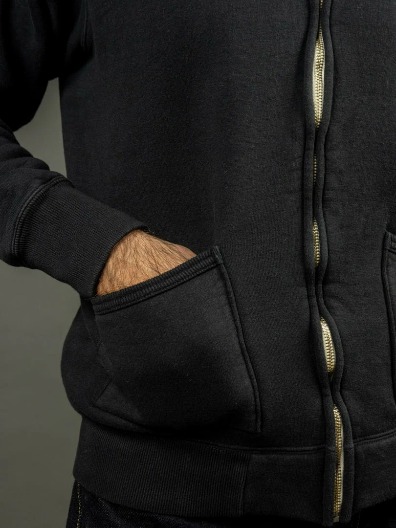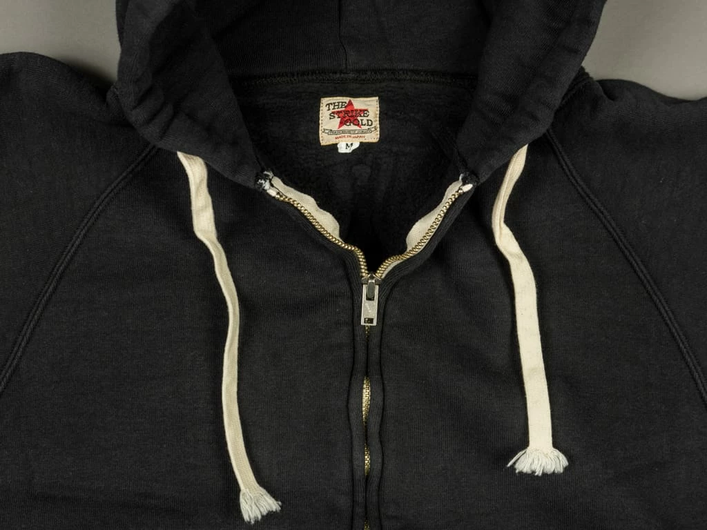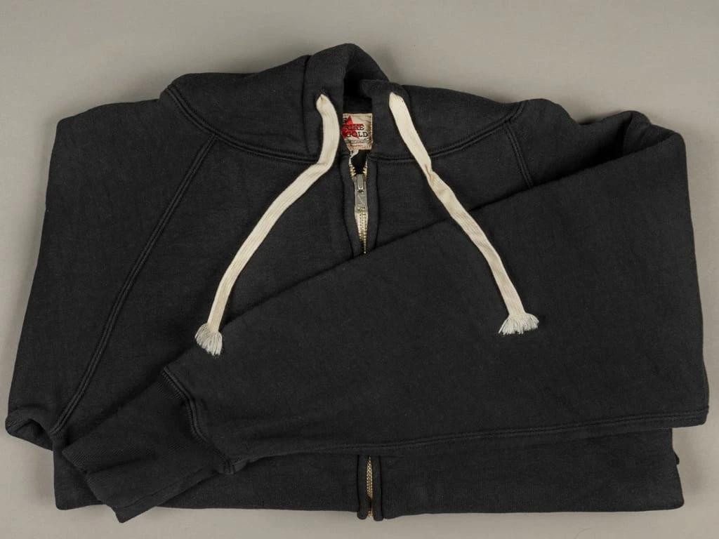 This Strike Gold Loopwheeled (“Tsuri-Ami”) hoodie is woven in the Japanese Kanekichi Wakayama workshop, one of only two workshops in the world still keeping in operation after more than 100 years the tubular textile production machines that allow seamless garments to be made. The only tension used in the knitting process is gravity, the end result being a knitted fabric with virtually no inbuilt stress or tension. A loopwheel machine rotates at just 24 revolutions per minute, with only 8-10 garments worth of fabric produced per day. A modern knitting machine in excess of 10 times that. The result is a heavyweight, soft but strong fabric, and the best sweatshirt material made today.