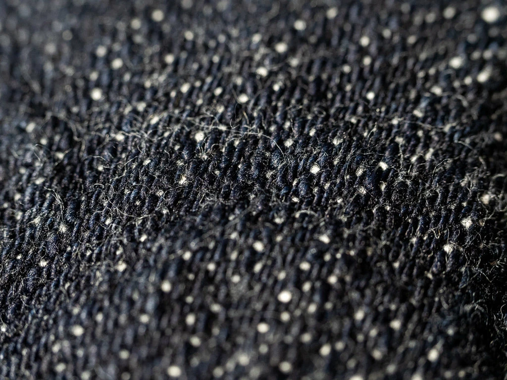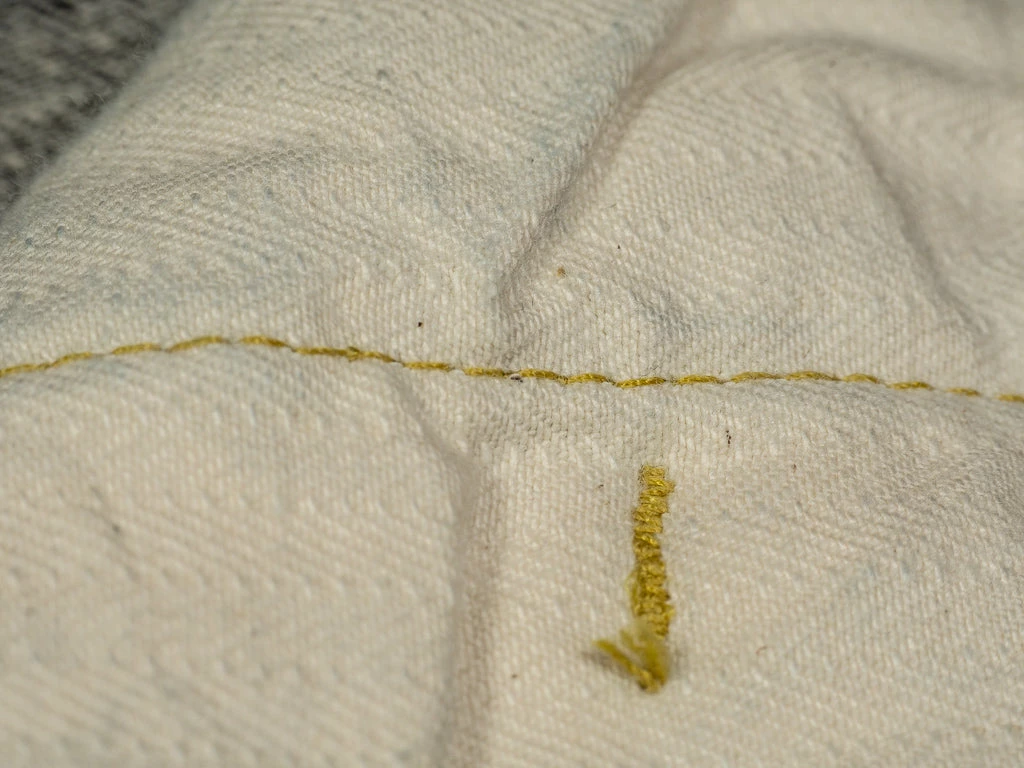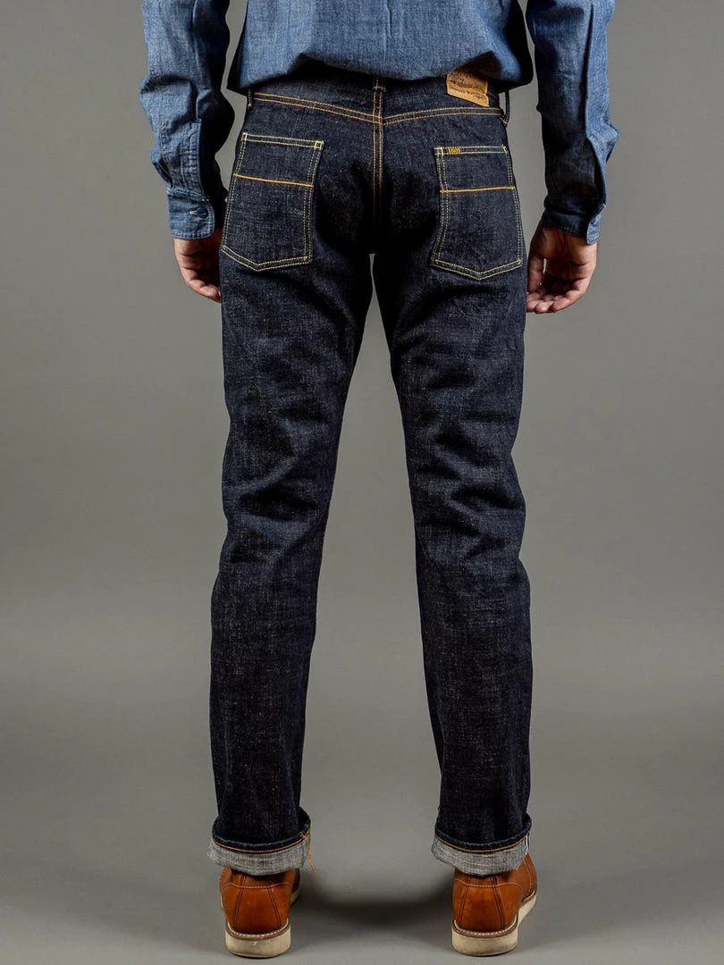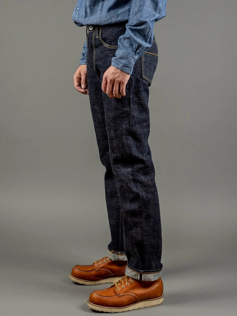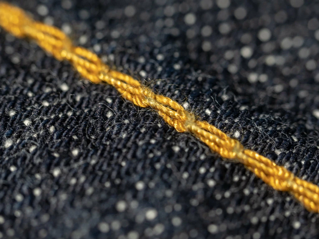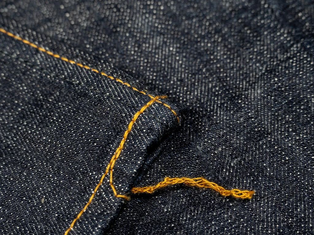 The jeans are made by using low-tension techniques applied, resulting in a sturdy yet lightweight 14.5oz fabric and a slightly rough and somewhat irregular average vintage roughness. All jeans have been stitched with a polyester and cotton blend yarn of variable width for maximum durability.