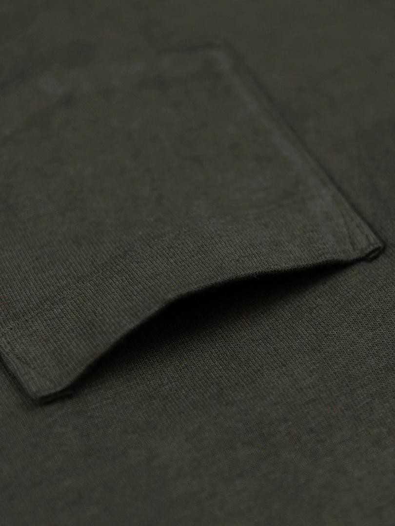 It is made from 100% cotton fabric called Tenjiku, which is gentle on the skin. This fabric is woven on a vintage sweatshirt loom and is achieved using 20 single yarns on the front and 30 on the reverse which avoids future skew after washes. The entire shirt uses an outstanding, highly skilled sewing process with a two-needle binder neck and double-needle stitched construction. It is finished with three white branded buttons.