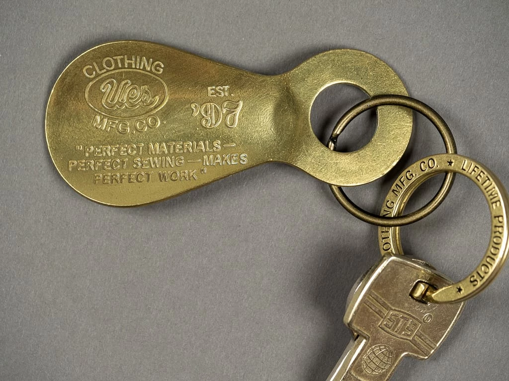 This is a shoehorn made from brass. It is combined with a key holder. With continued use, the colour of the dark brass comes out. When you attach this to a belt or a bag, it will prove convenient for you when you wear shoes.